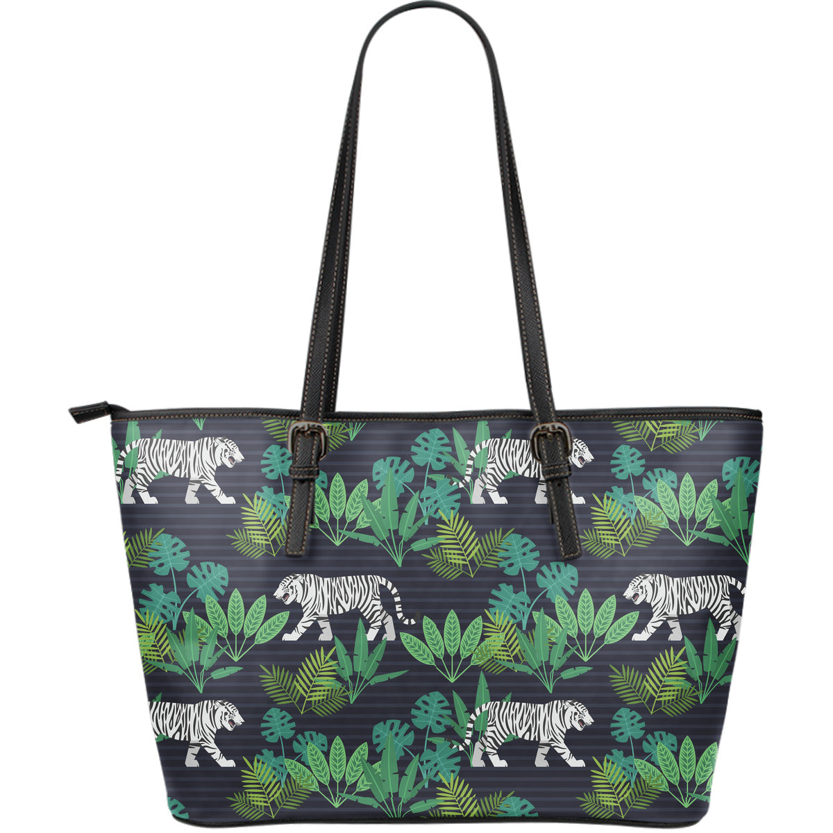 white bengal tigers tropical plant Large Leather Tote Bag is a uniqued design and limited item. It made to order, hand printed, and sewn with love in our factory.
