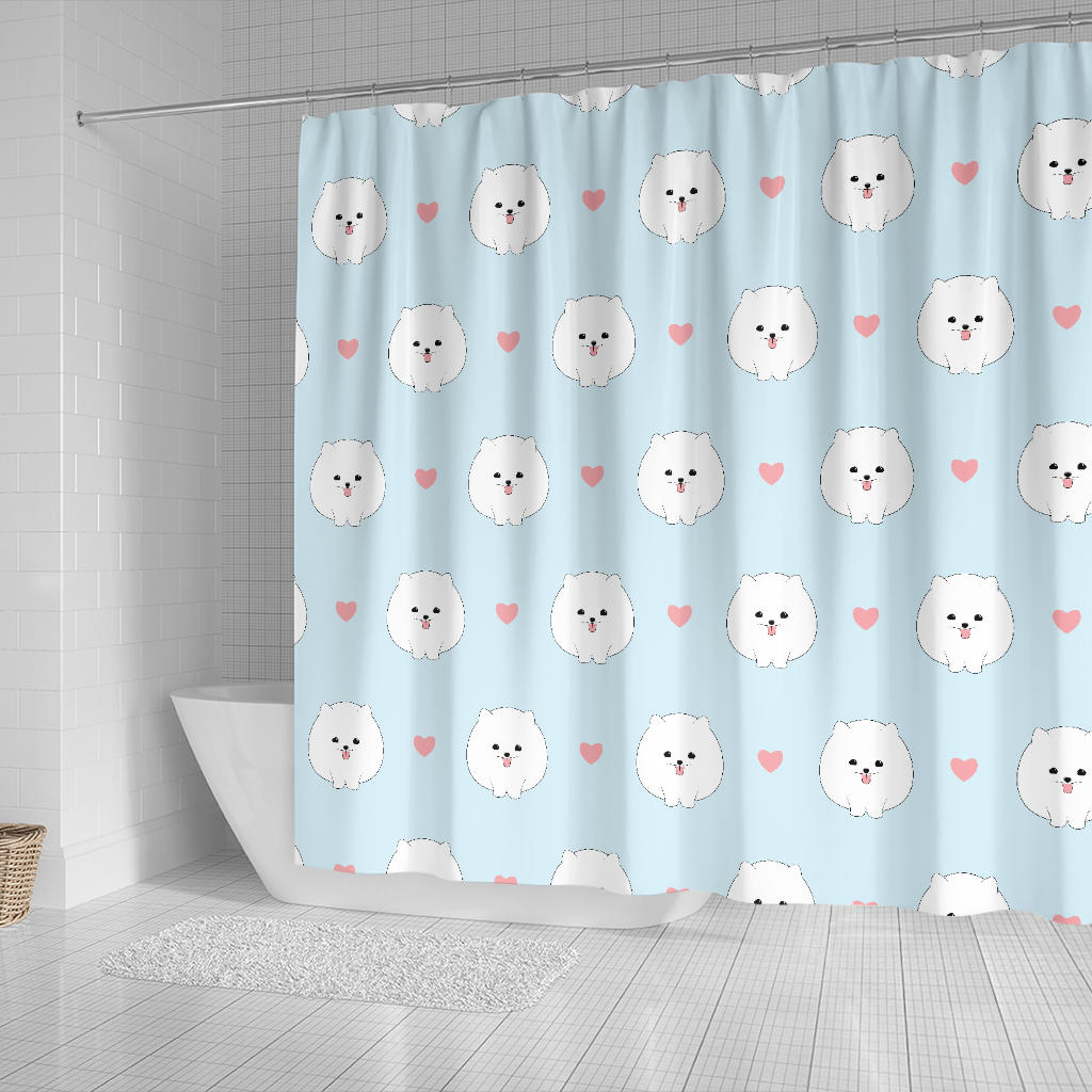 White cute pomeranian pattern Shower Curtain is a uniqued design and limited item. It made to order, hand printed, and sewn with love in our factory.