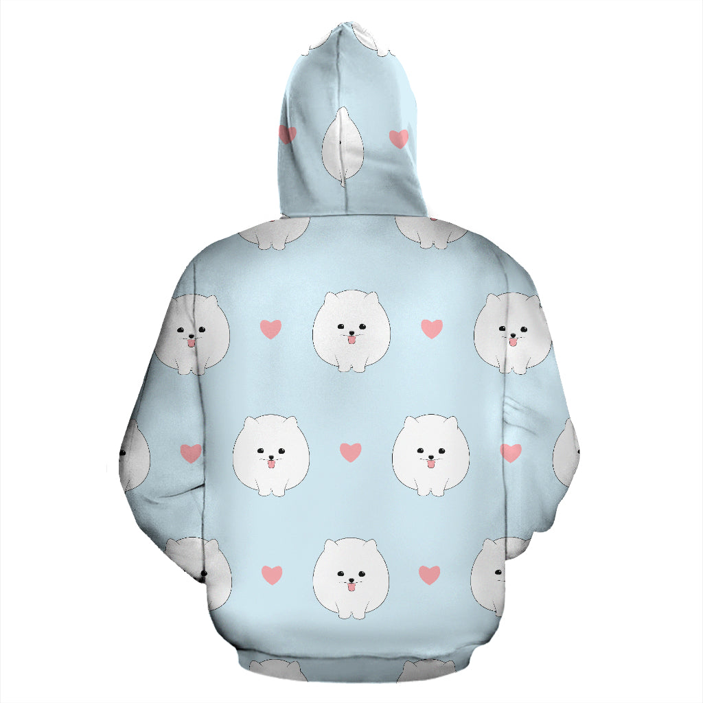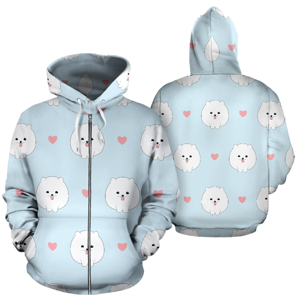 White Cute Pomeranian Pattern Zip Up Hoodie