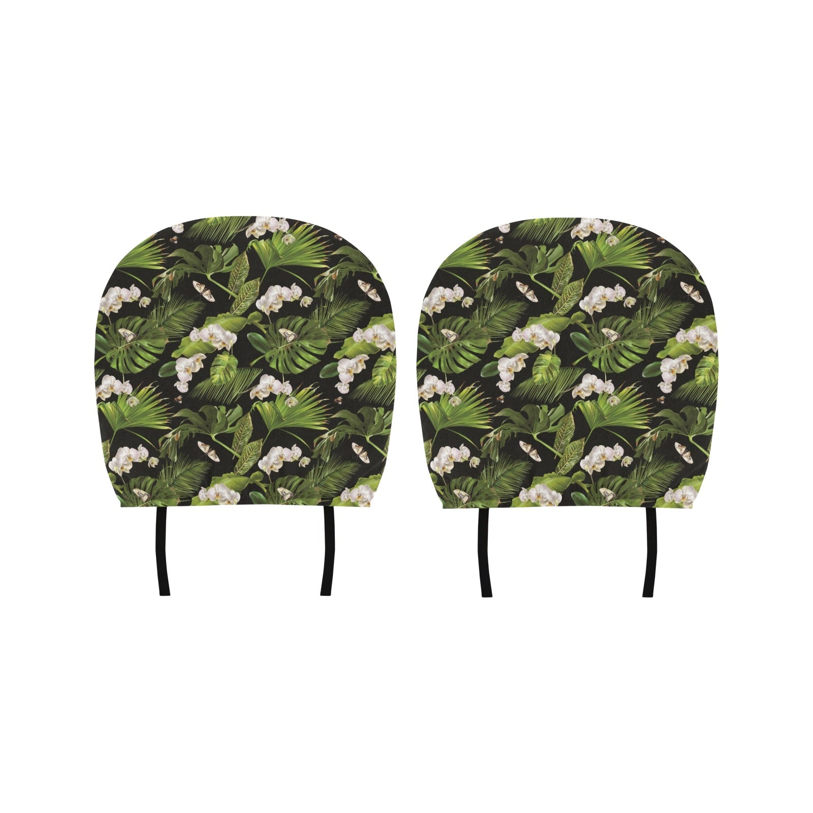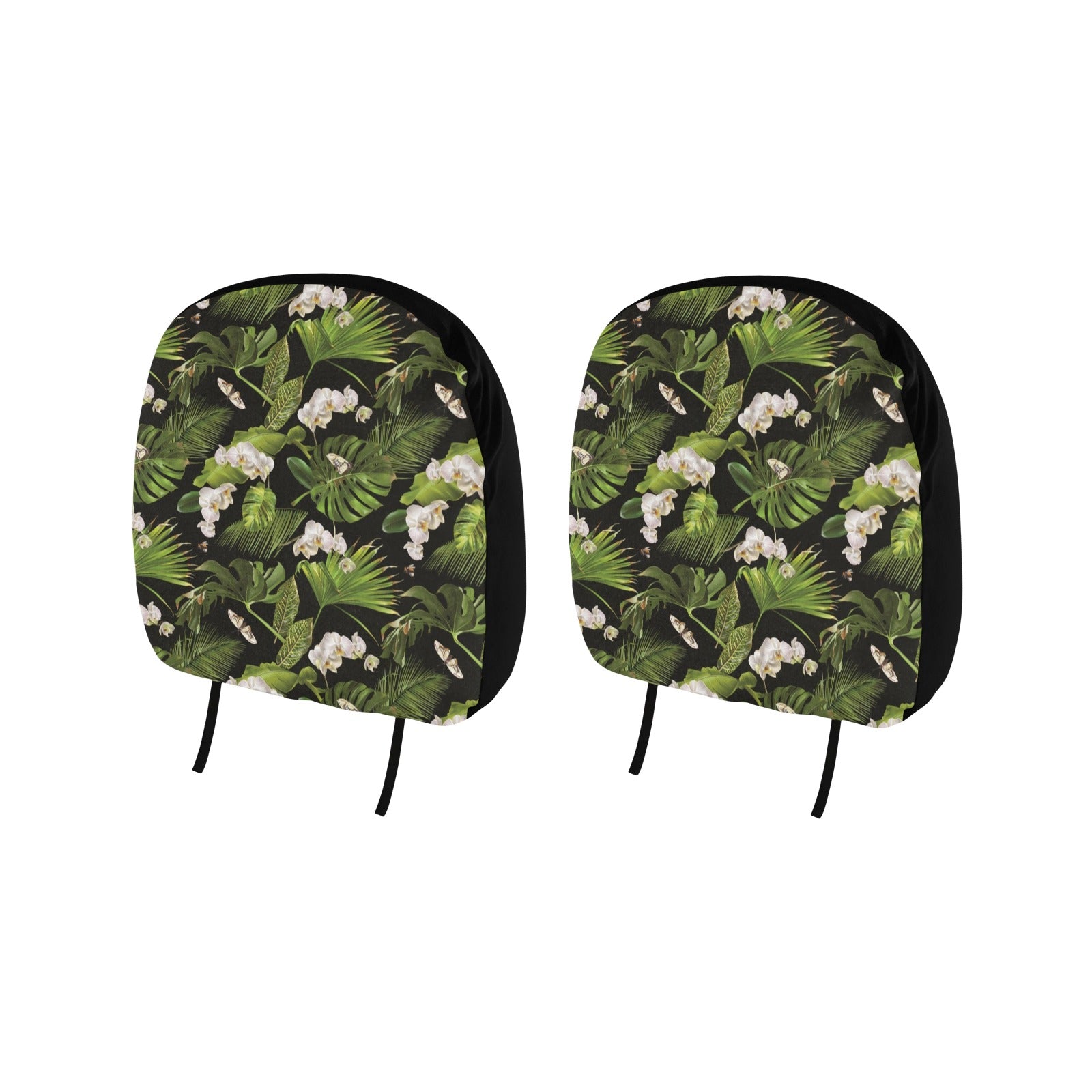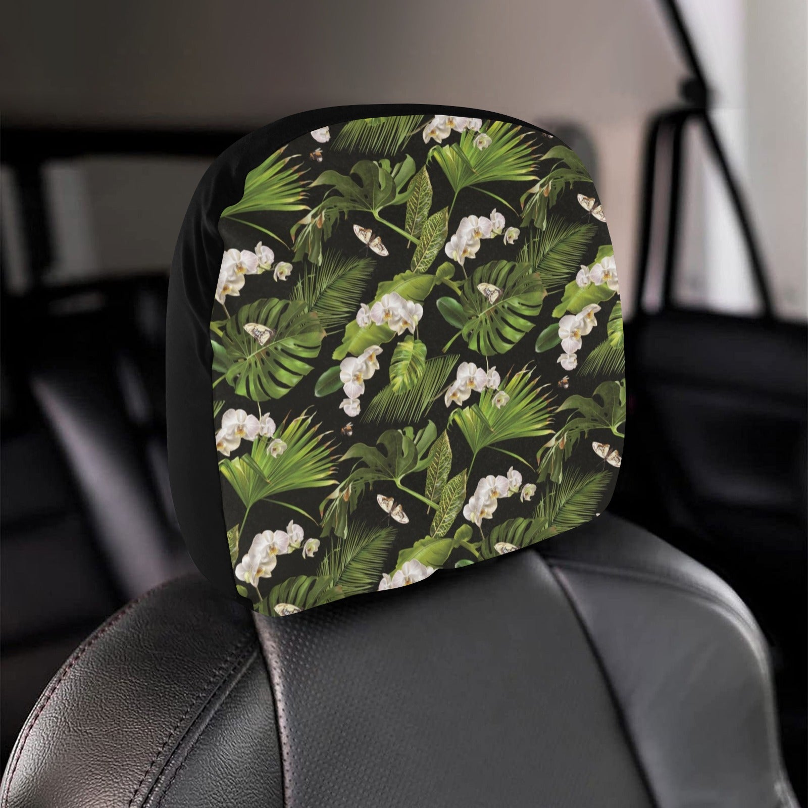 White orchid flower tropical leaves pattern blackg Car Headrest Cover
