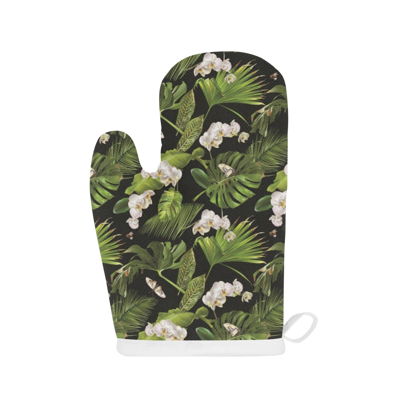 White orchid flower tropical leaves pattern blackg Heat Resistant Oven Mitts