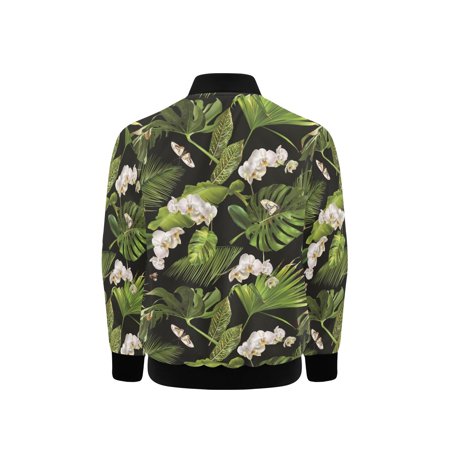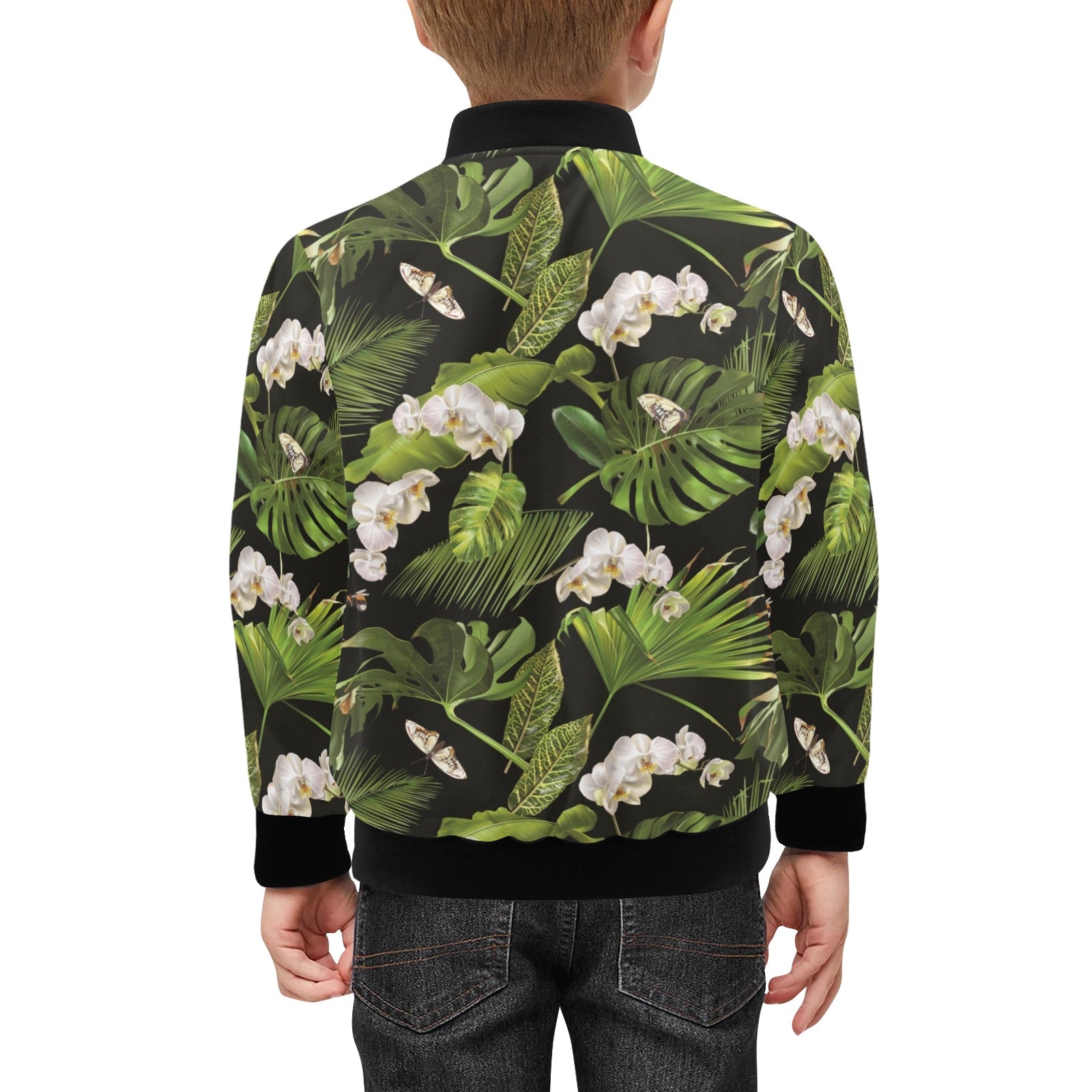 White orchid flower tropical leaves pattern blackg Kids' Boys' Girls' Bomber Jacket