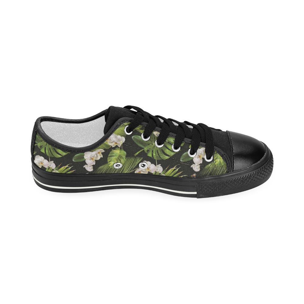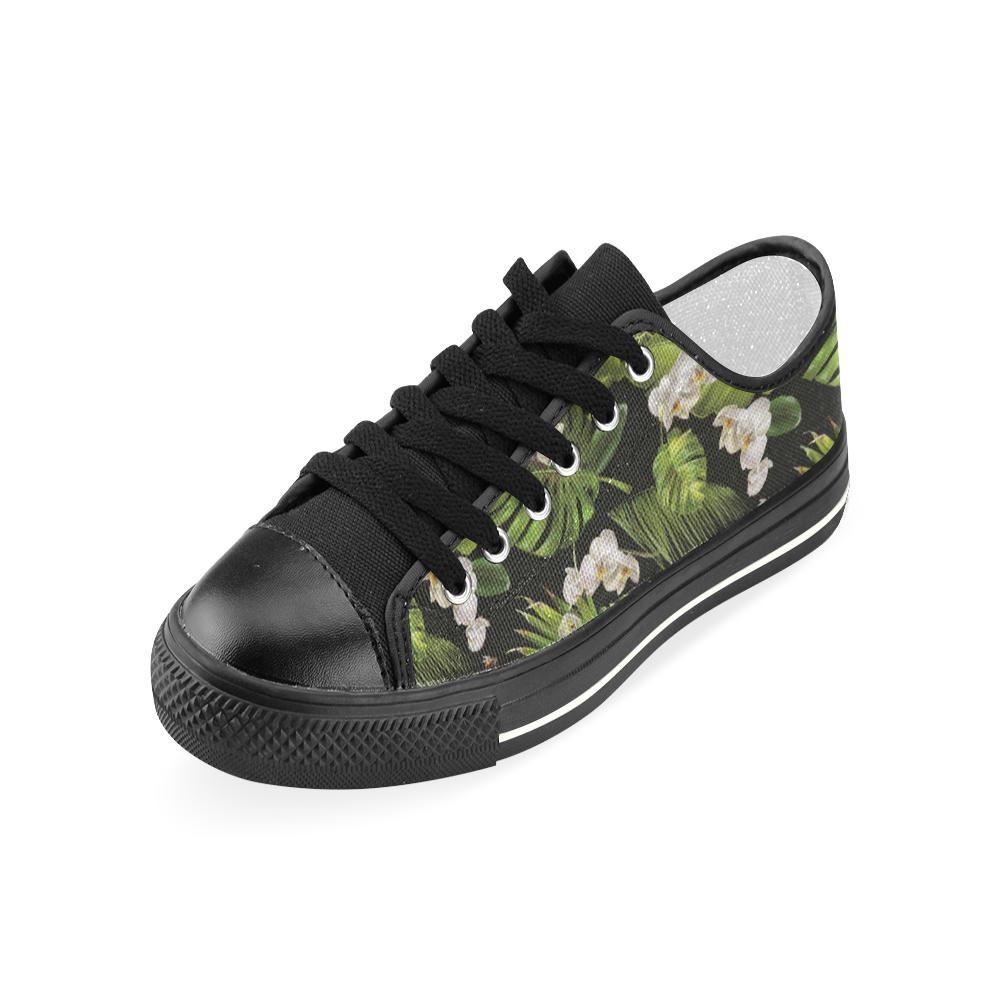 White orchid flower tropical leaves pattern blackg Kids' Boys' Girls' Low Top Canvas Shoes Black