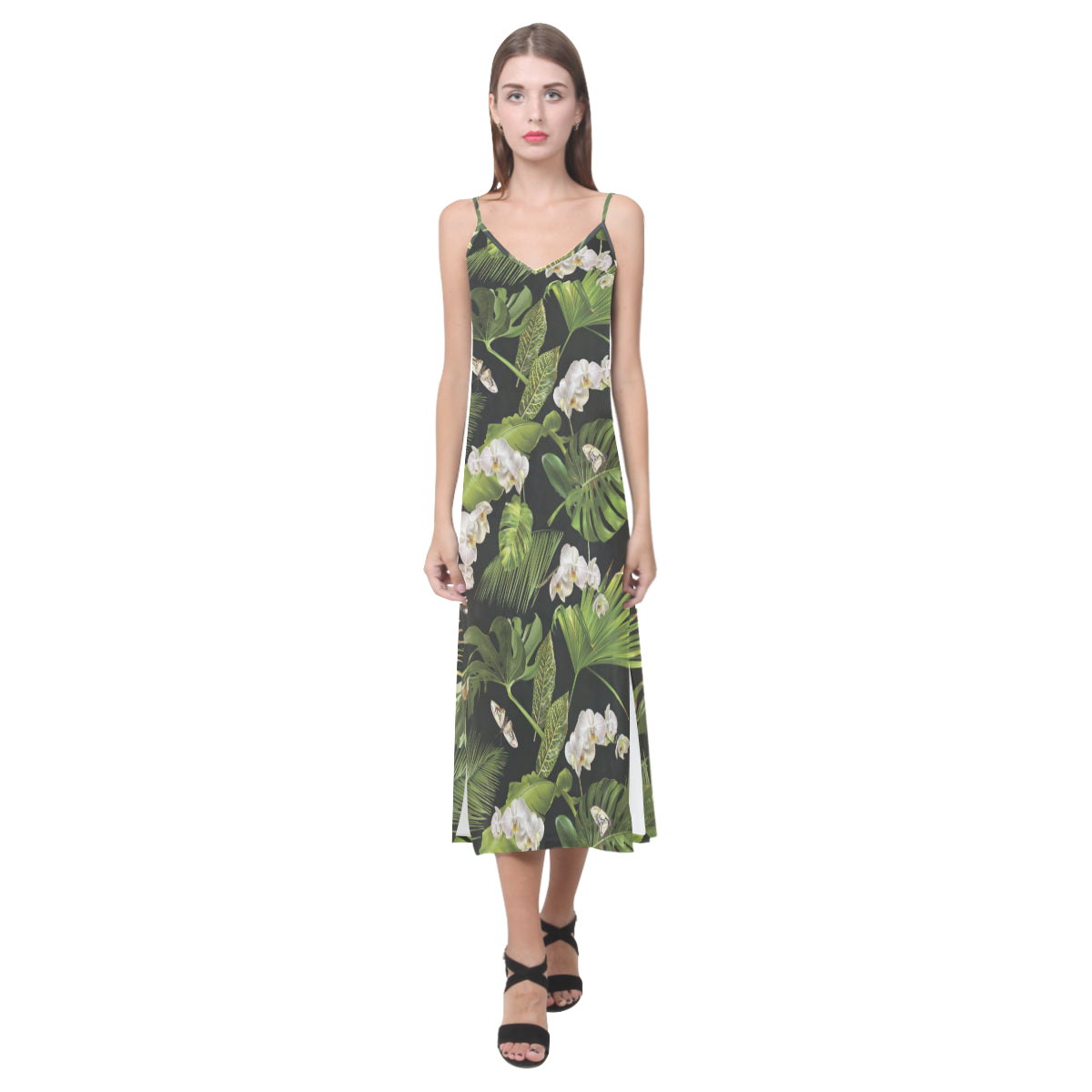 White orchid flower tropical leaves pattern blackg V-Neck Open Fork Long Dress is a uniqued design and limited item. It made to order, hand printed, and sewn with love in our factory.