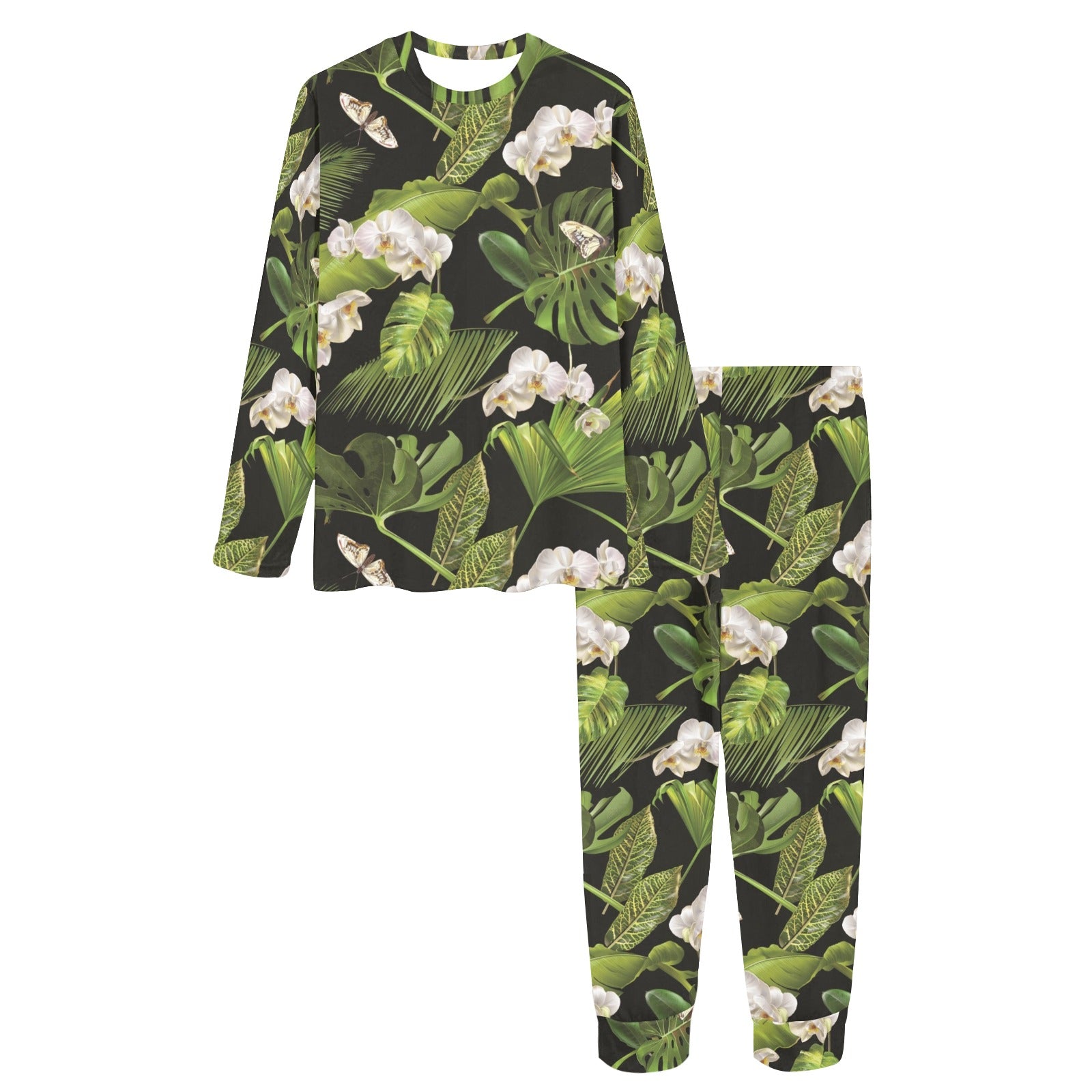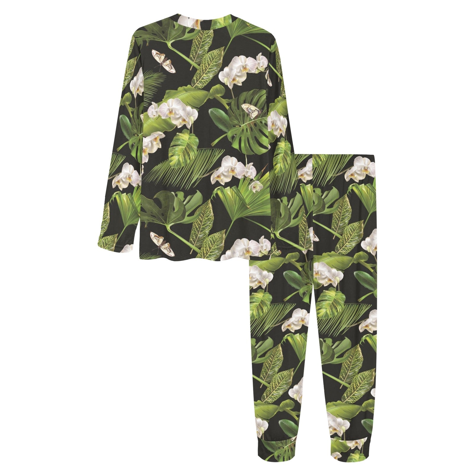 White orchid flower tropical leaves pattern blackg Women's All Over Print Pajama Set