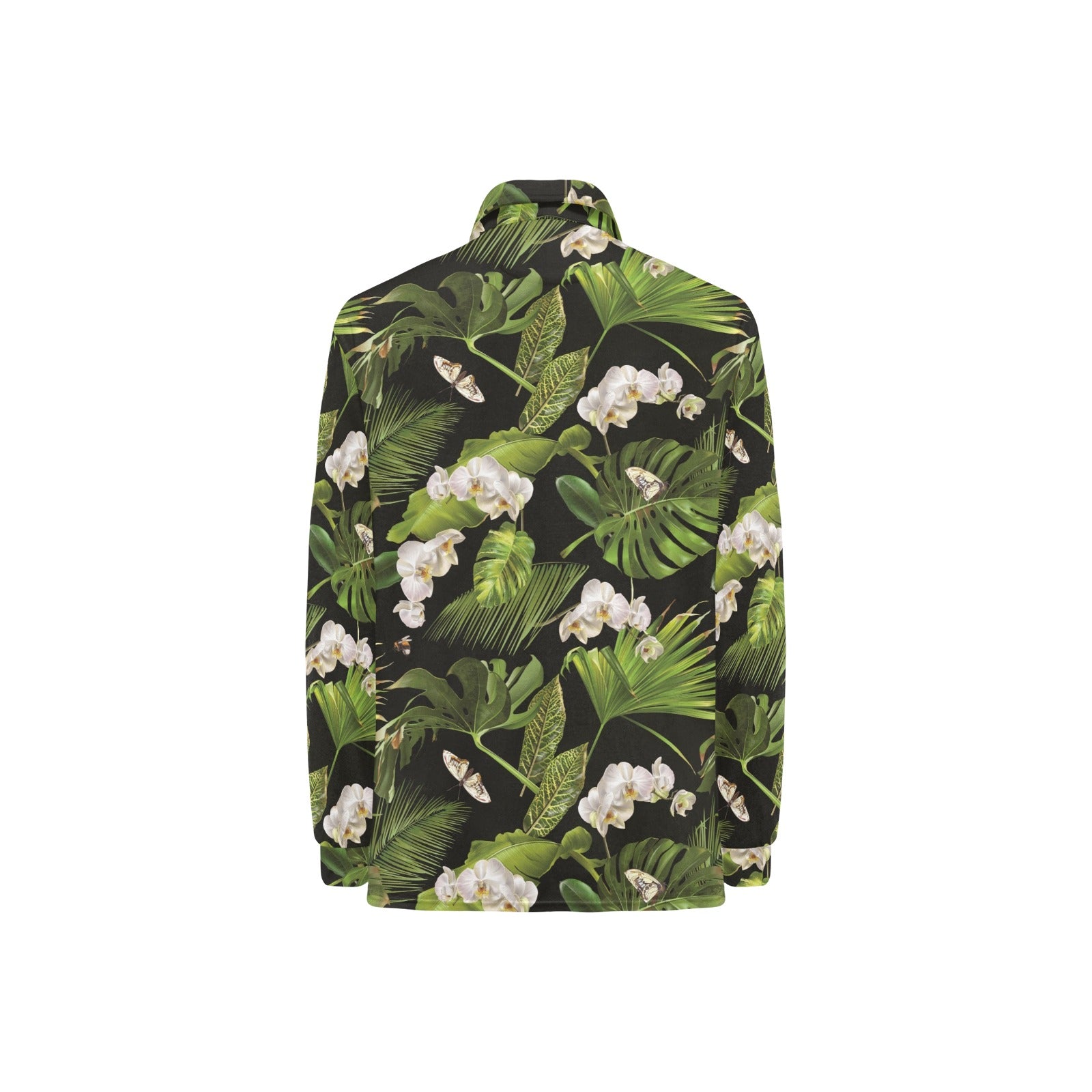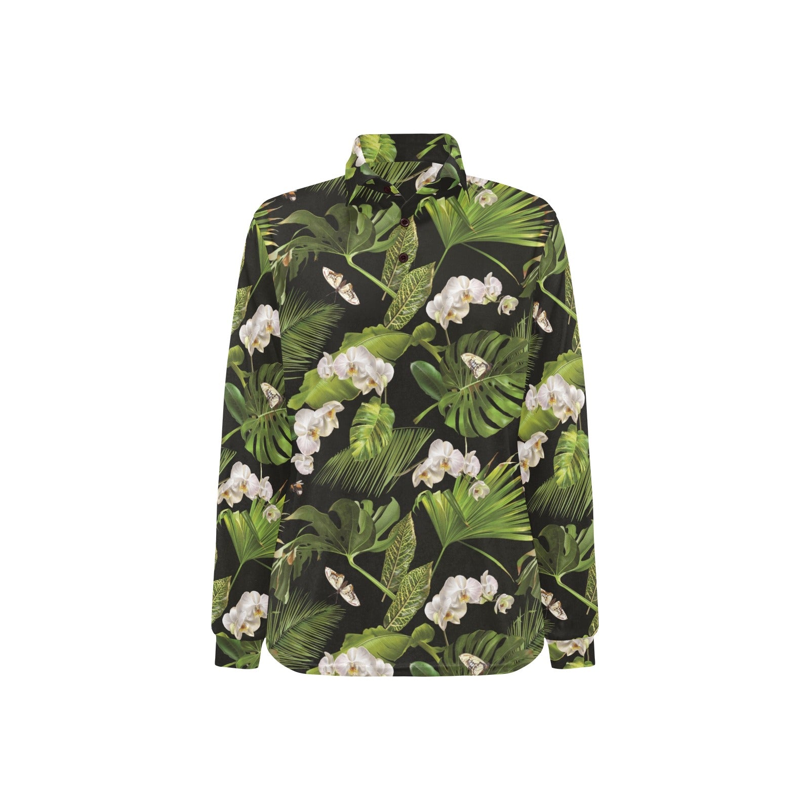 White orchid flower tropical leaves pattern blackg Women's Long Sleeve Polo Shirt