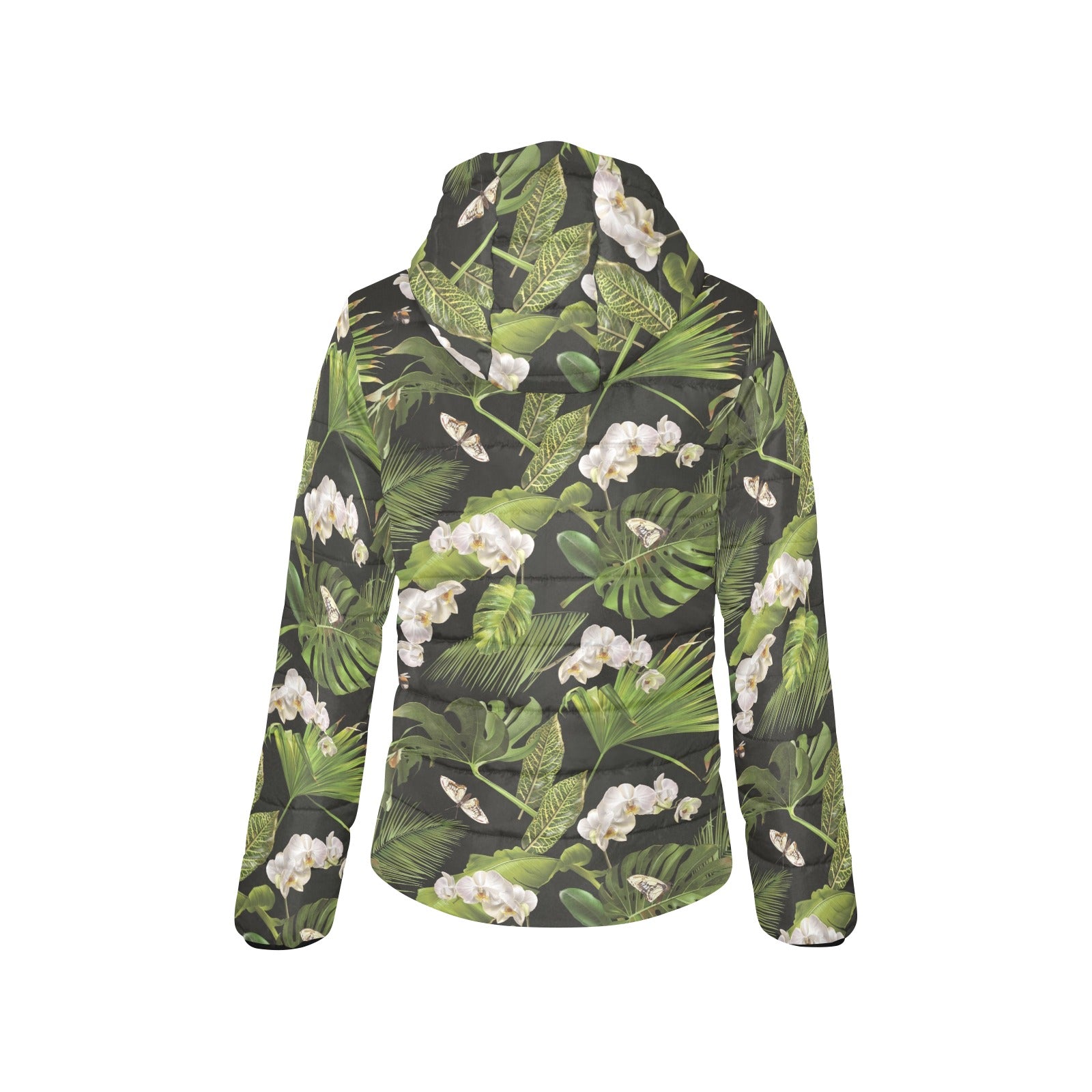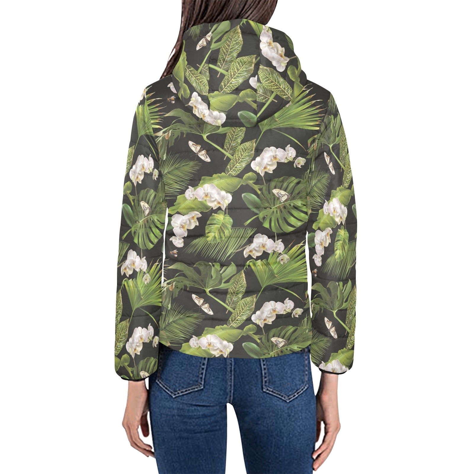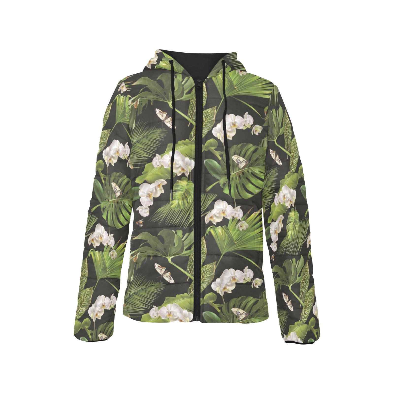 White orchid flower tropical leaves pattern blackg Women's Padded Hooded Jacket