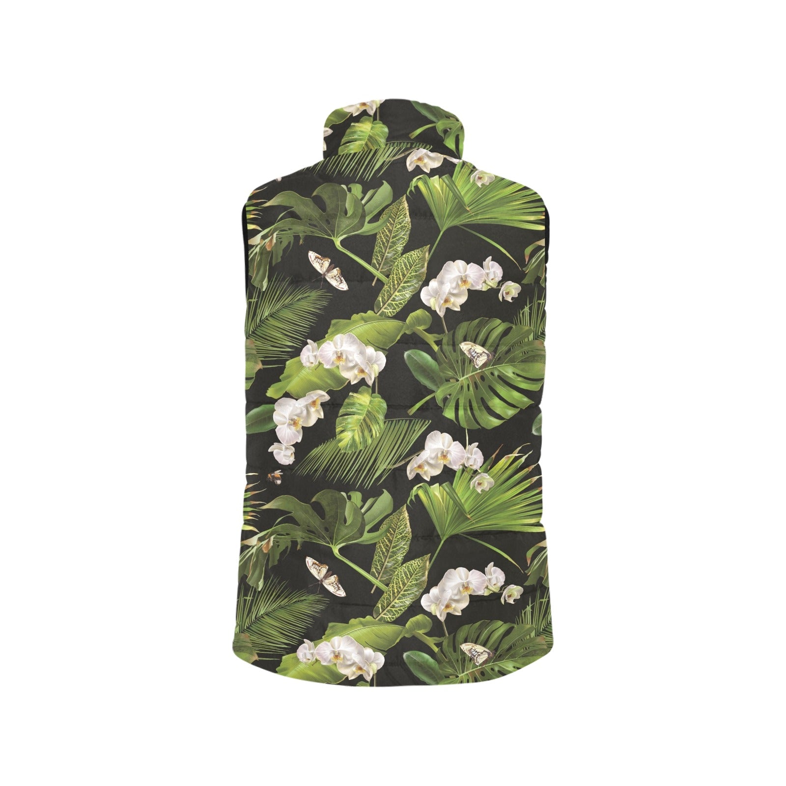 White orchid flower tropical leaves pattern blackg Women's Padded Vest