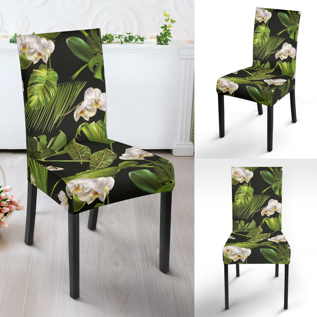 White Orchid Flower Tropical Leaves Pattern Blackground Dining Chair Slipcover