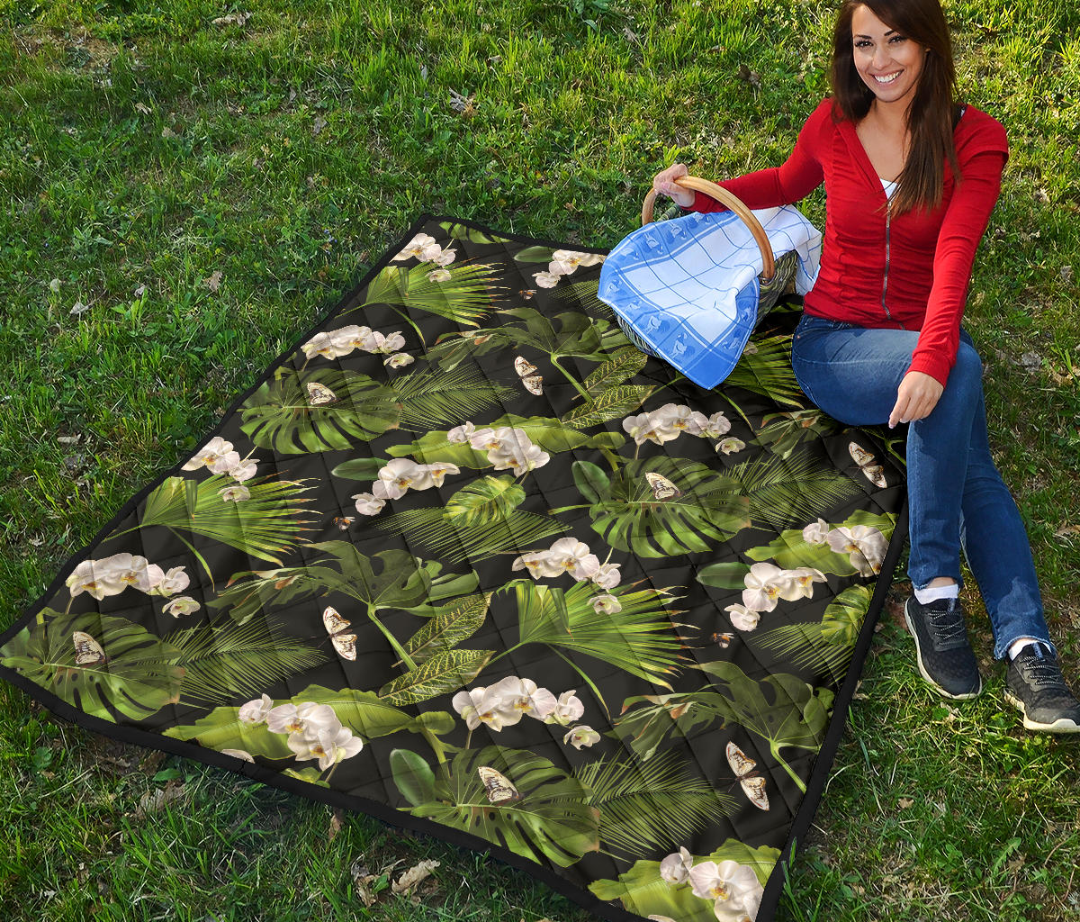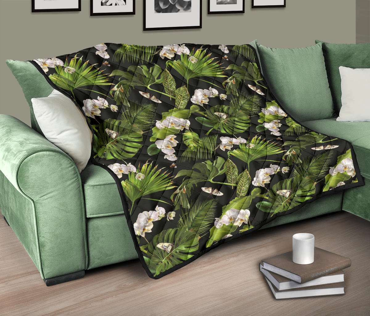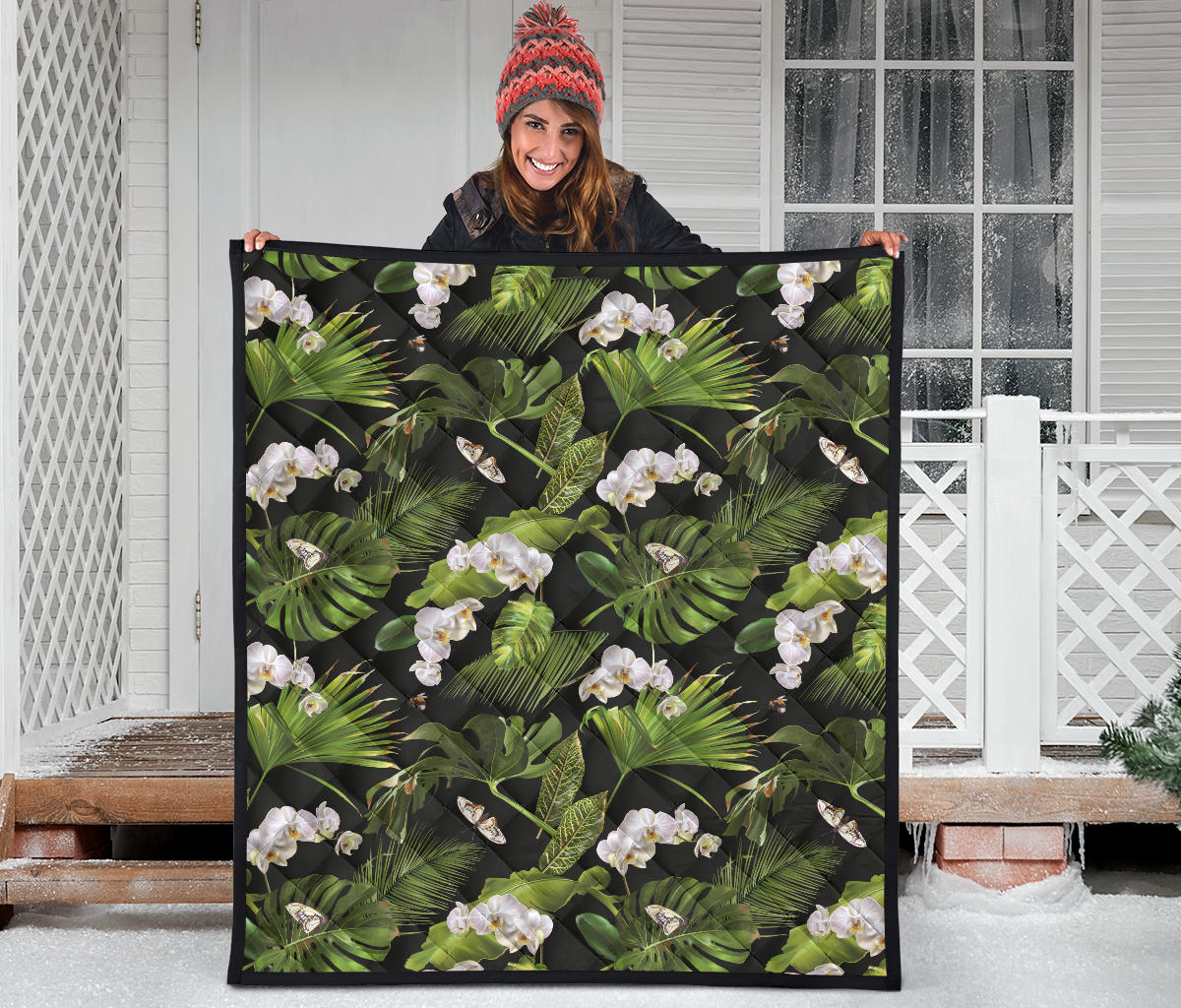 White Orchid Flower Tropical Leaves Pattern Blackground Premium Quilt is a uniqued design and limited item. It made to order, hand printed, and sewn with love in our factory.