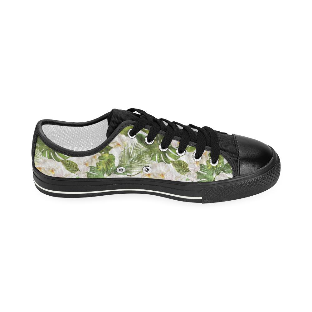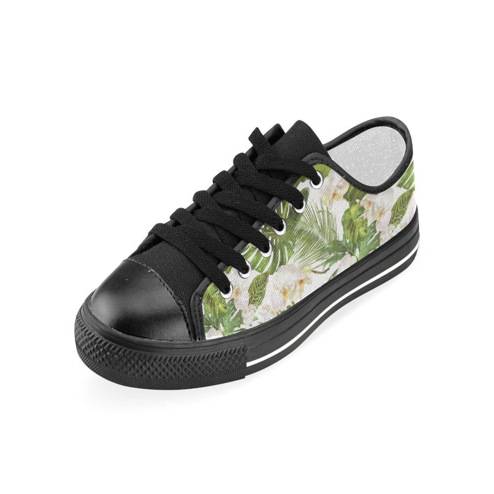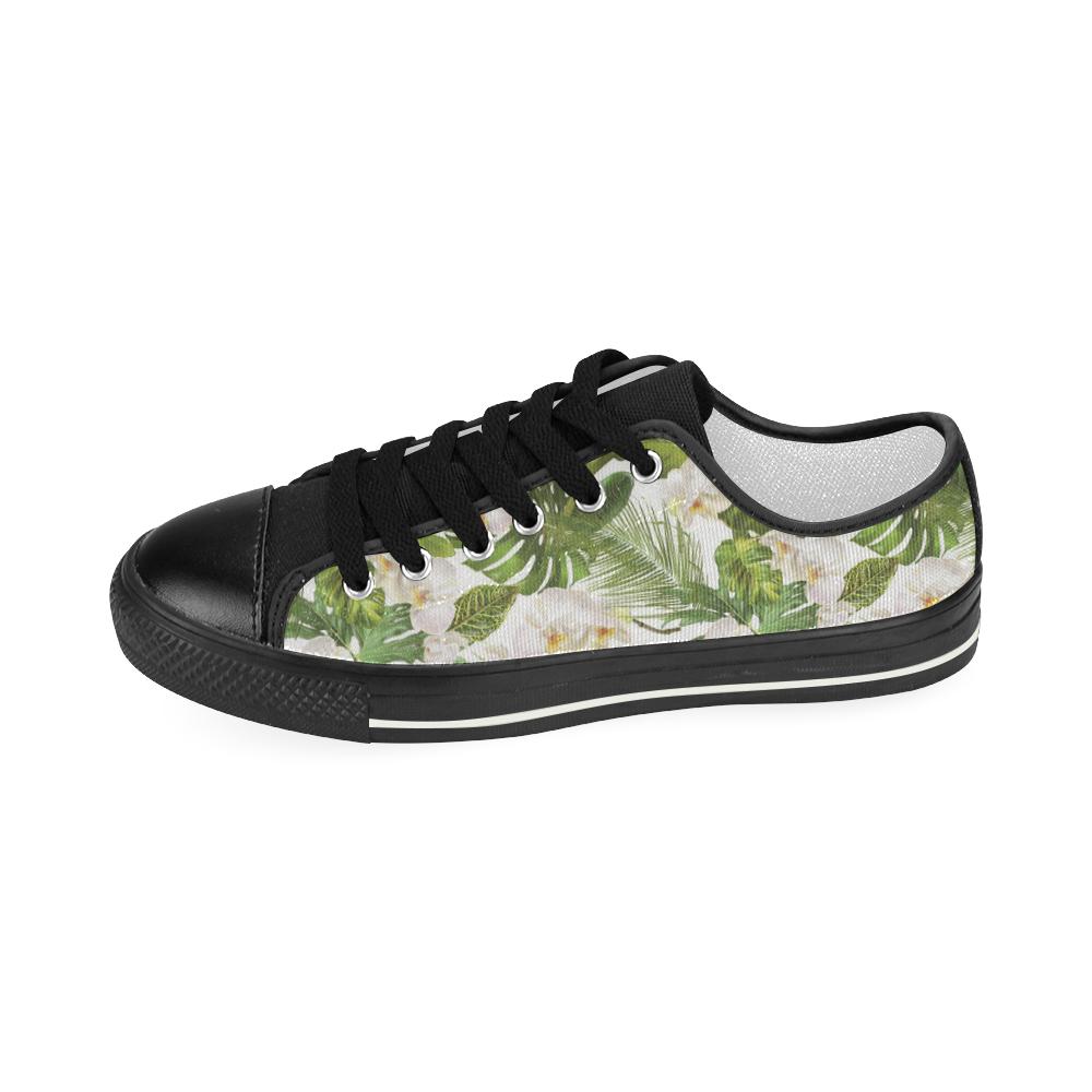 White orchid flower tropical leaves pattern Kids' Boys' Girls' Low Top Canvas Shoes Black