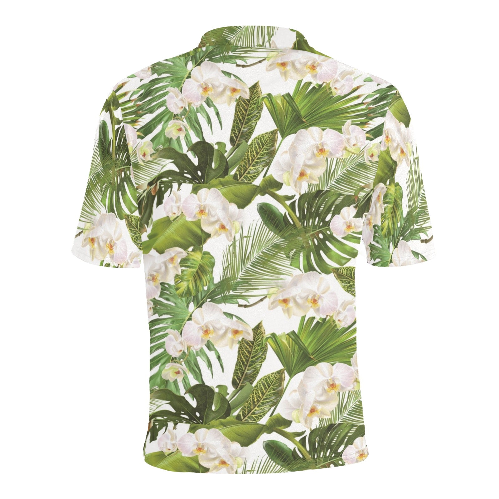 White orchid flower tropical leaves pattern Men's All Over Print Polo Shirt