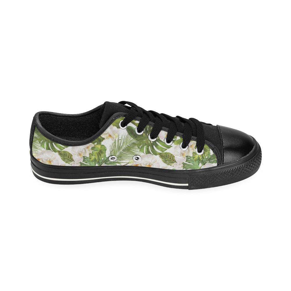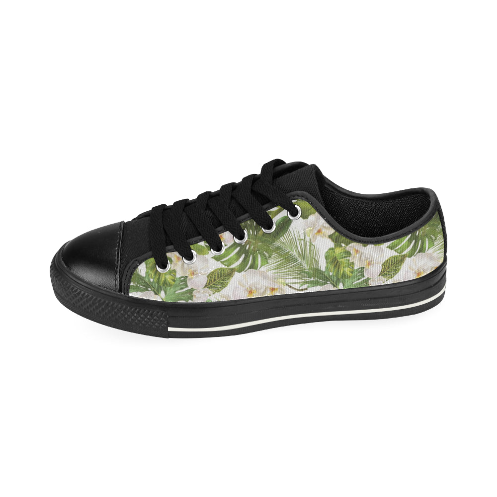 White orchid flower tropical leaves pattern Men's Low Top Canvas Shoes Black