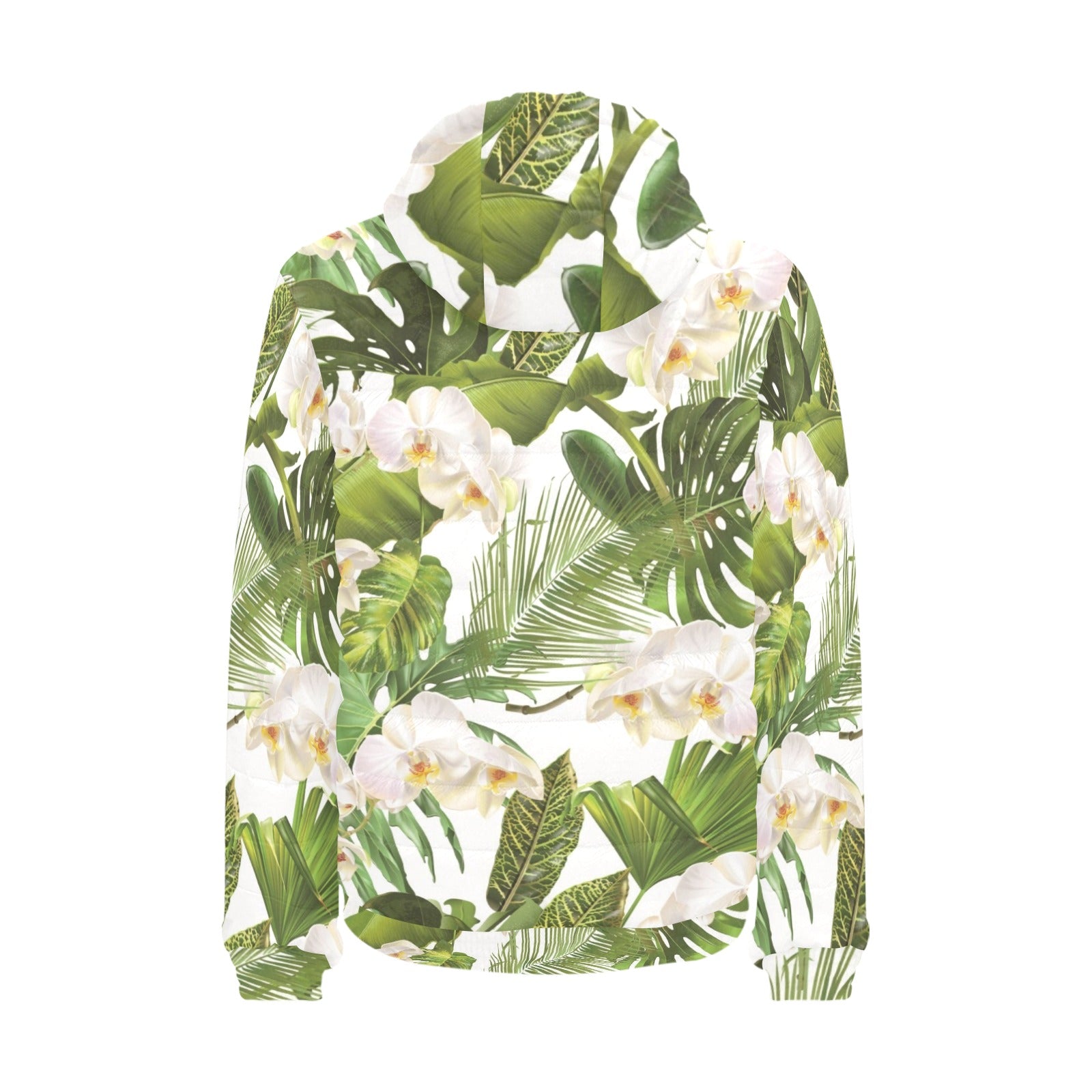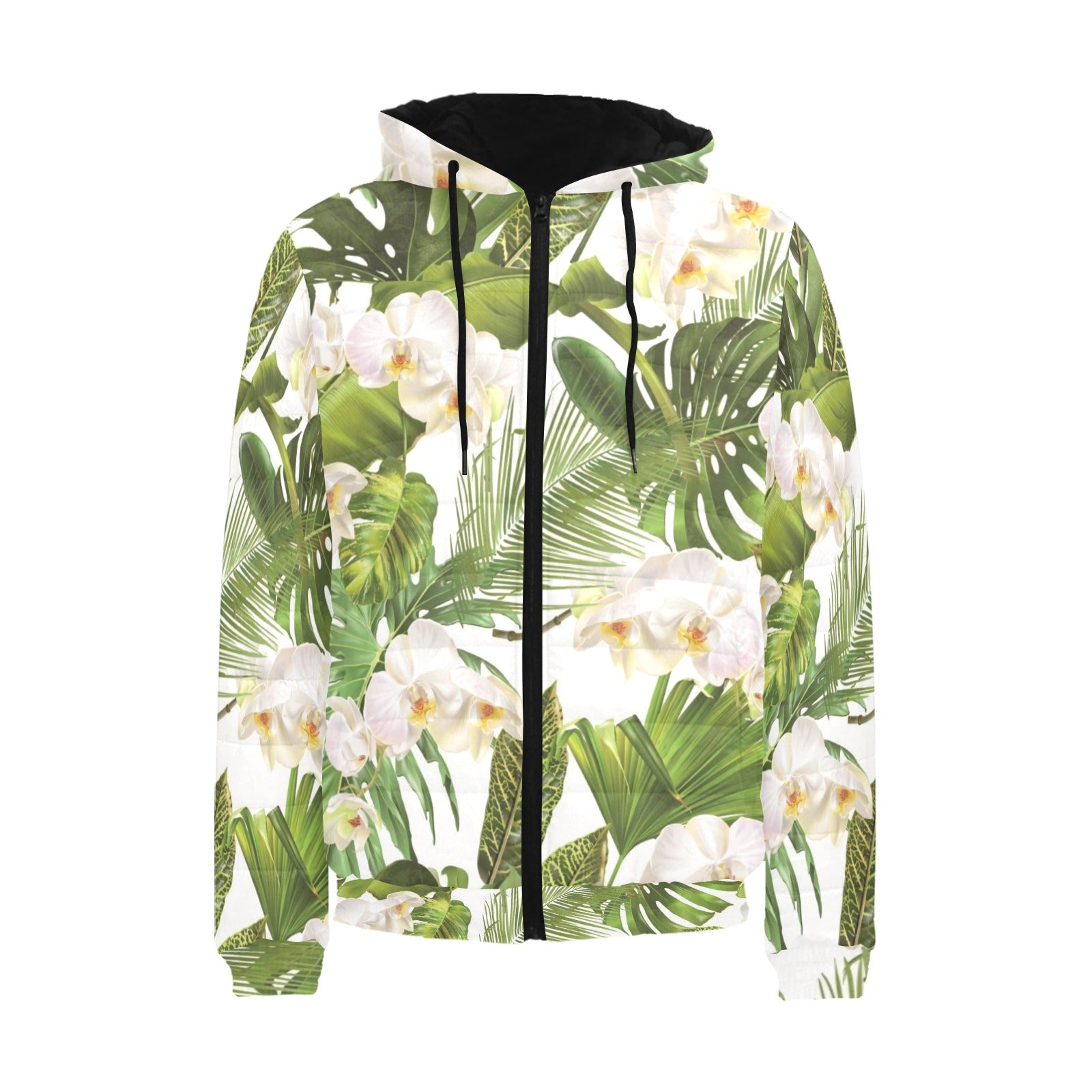 White orchid flower tropical leaves pattern Men's Padded Hooded Jacket