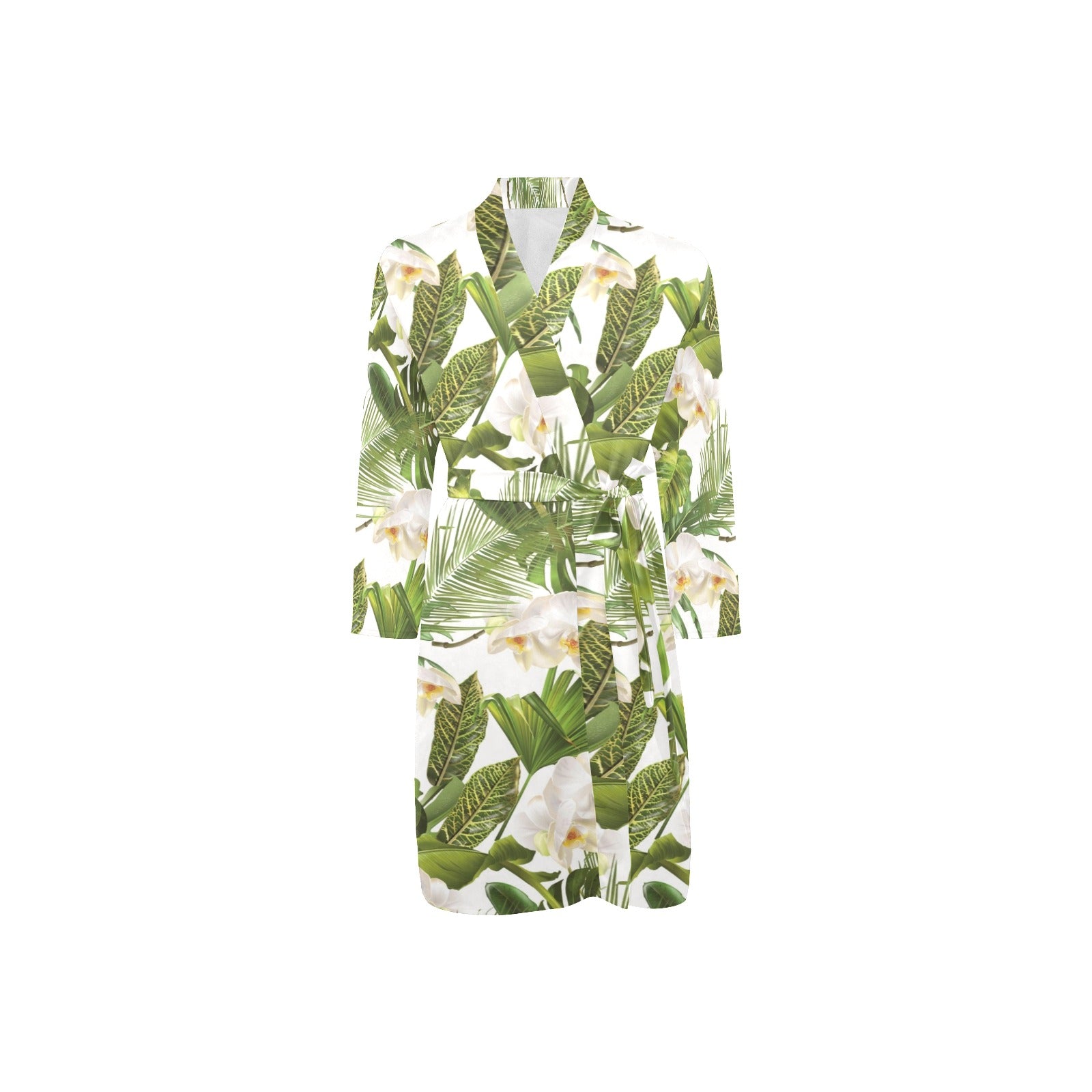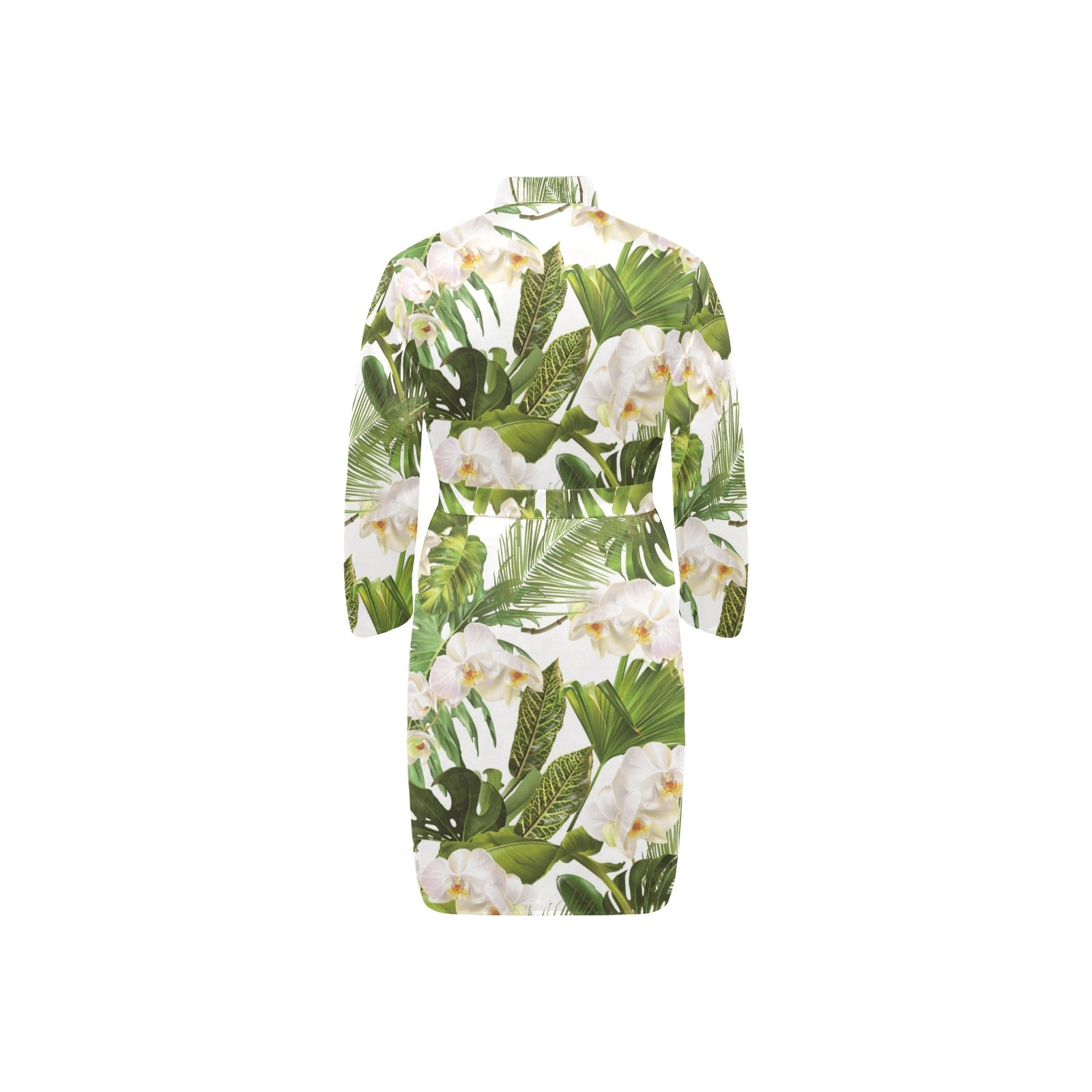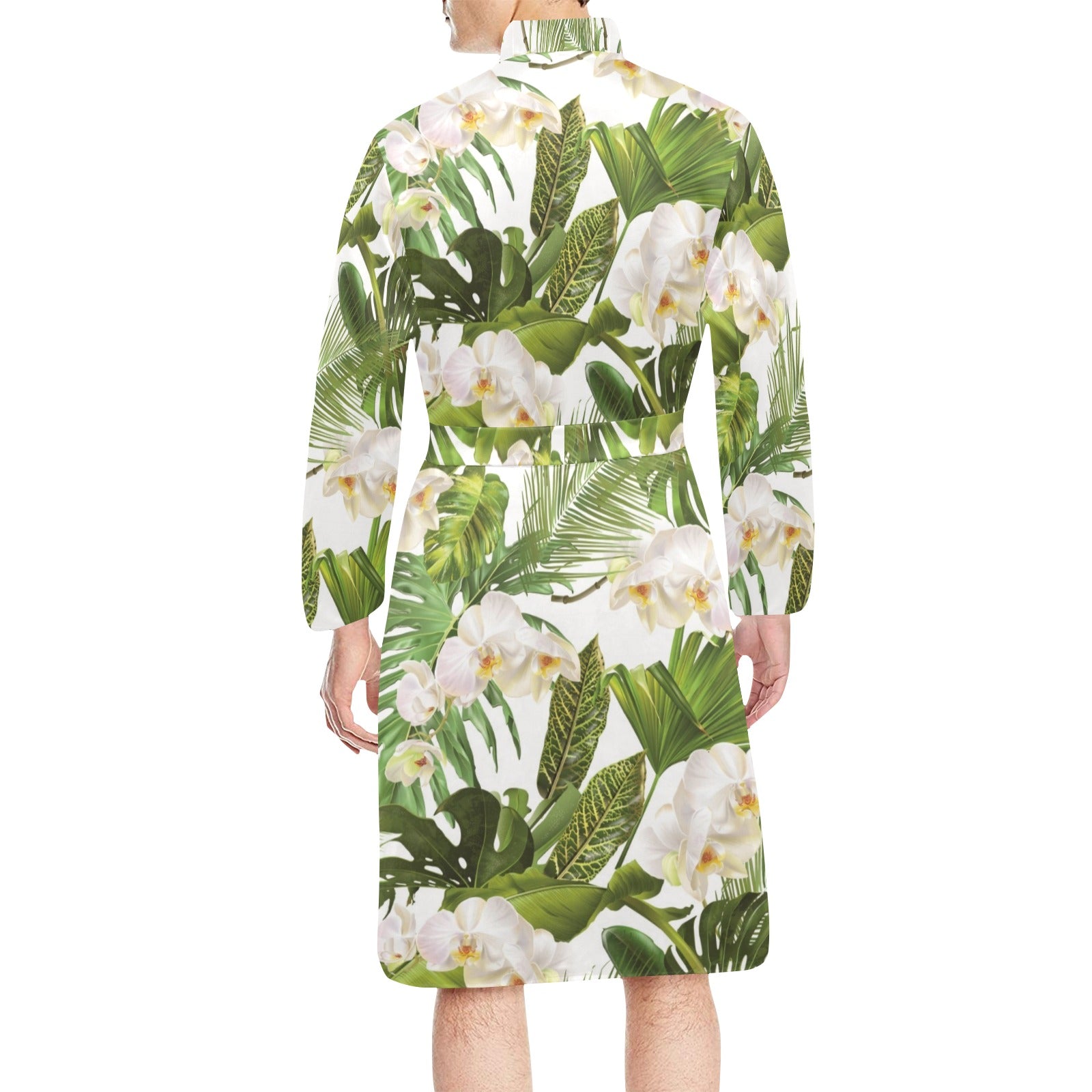 White orchid flower tropical leaves pattern Men's Long Sleeve Belted Night Robe