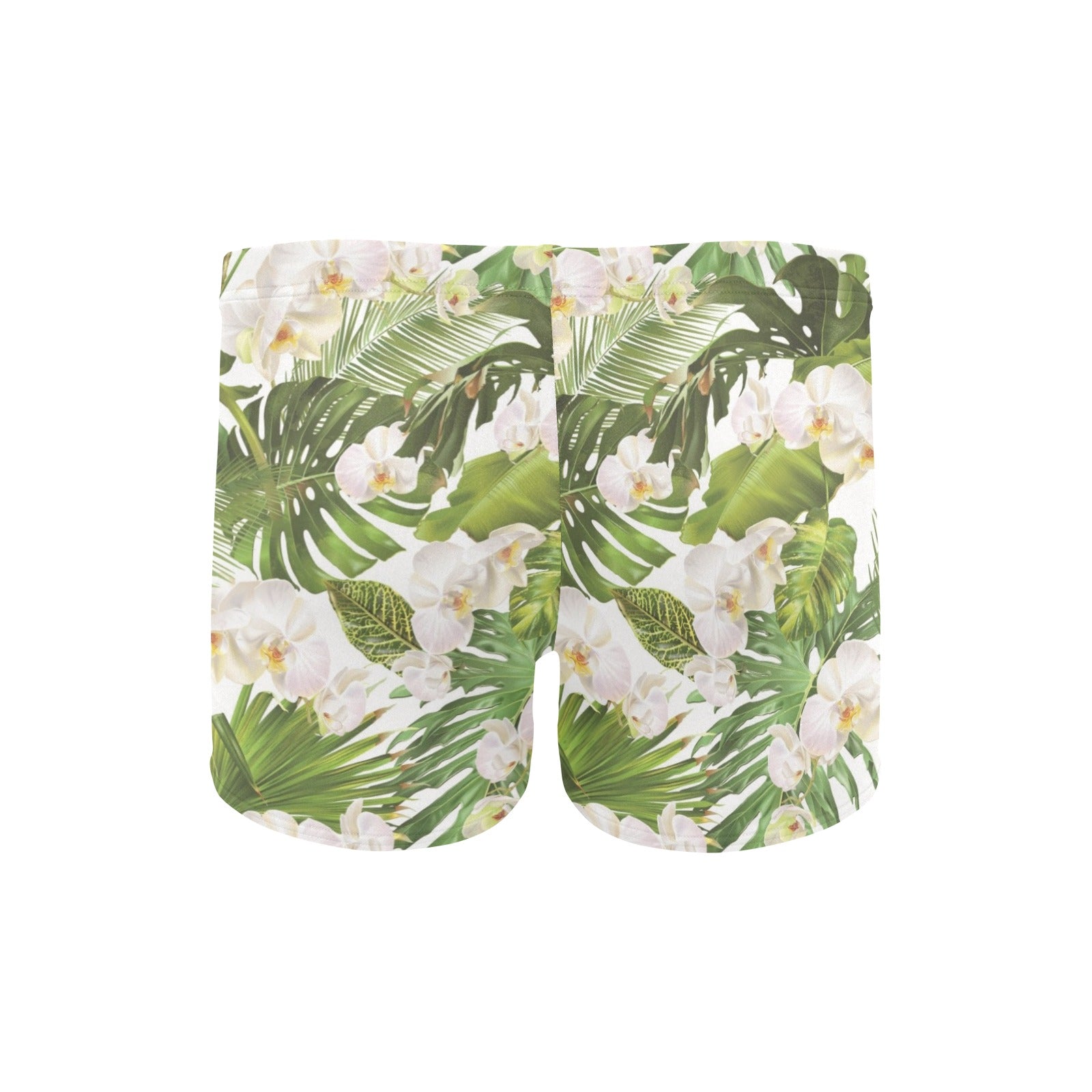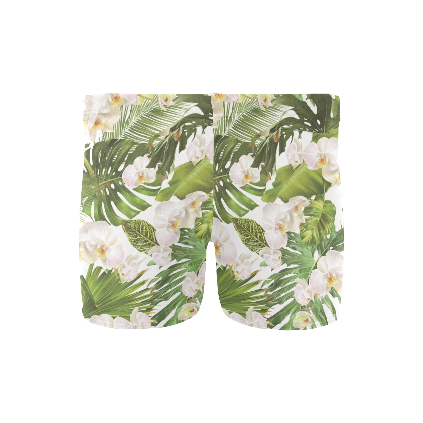 White orchid flower tropical leaves pattern Men's Swimming Trunks