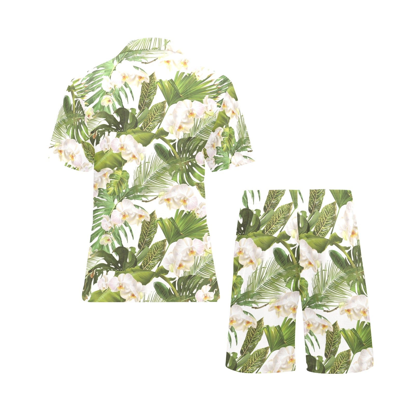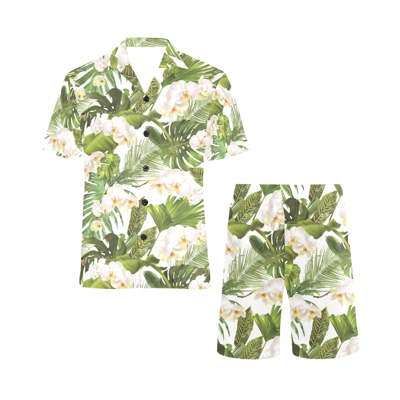 White orchid flower tropical leaves pattern Men's V-Neck Short Pajama Set