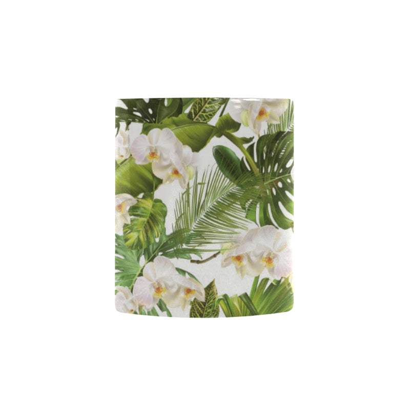 White orchid flower tropical leaves pattern Morphing Mug Heat Changing Mug