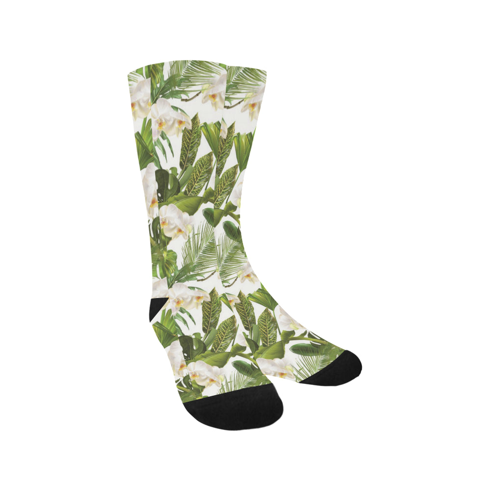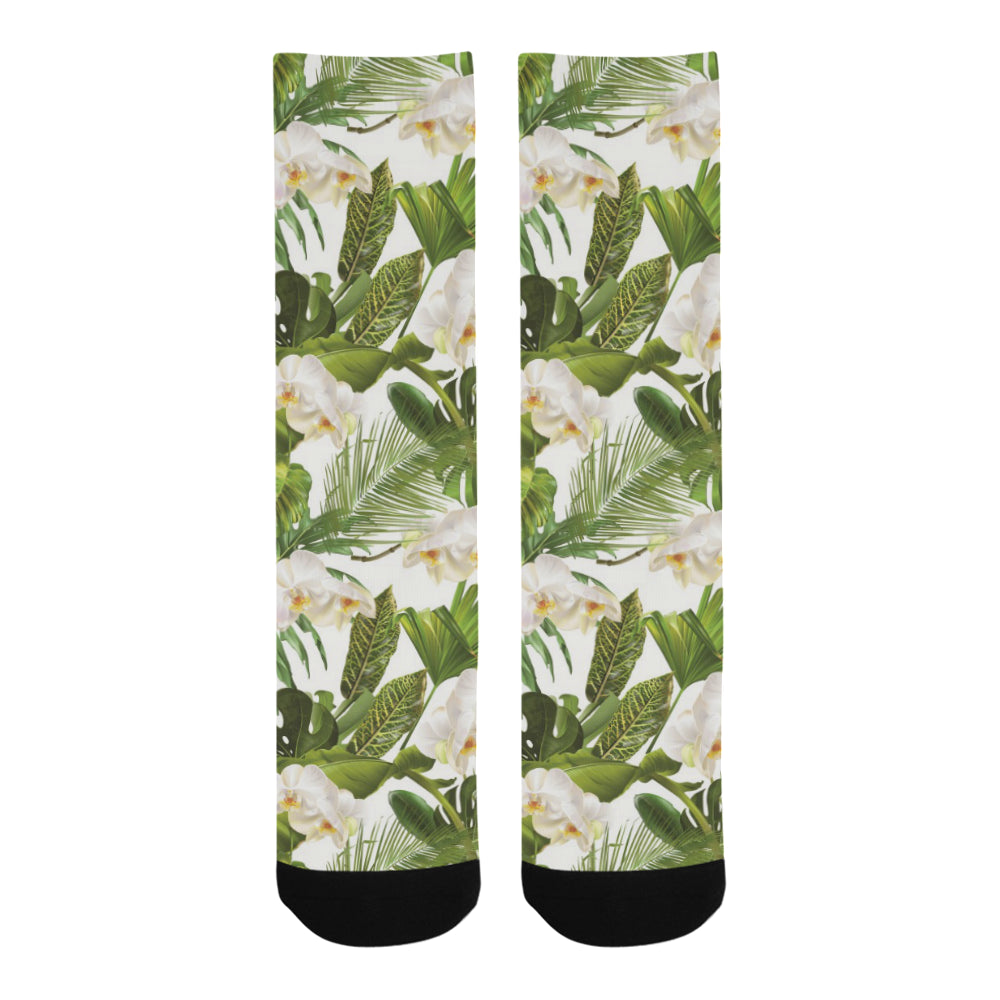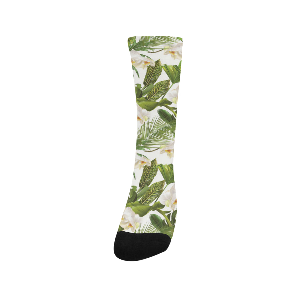 White orchid flower tropical leaves pattern Crew Socks are uniqued design and limited item. It made to order, hand printed, and sewn with love in our factory.