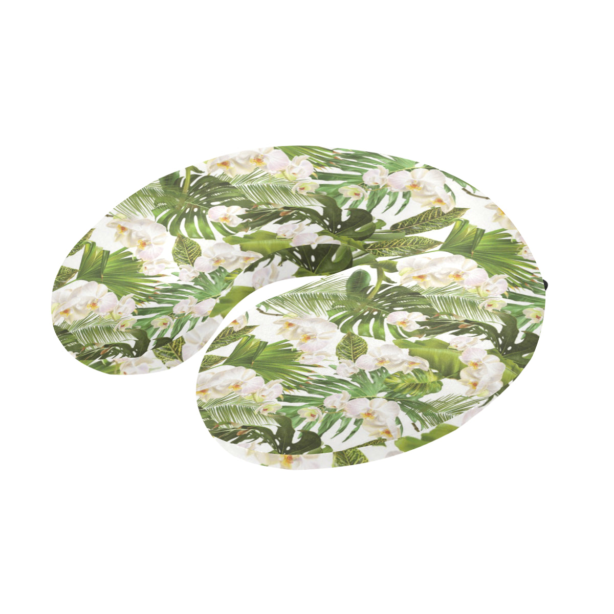 White orchid flower tropical leaves pattern U-Shaped Travel Neck Pillow