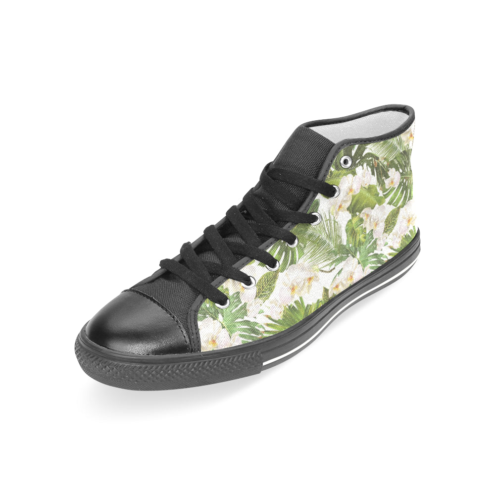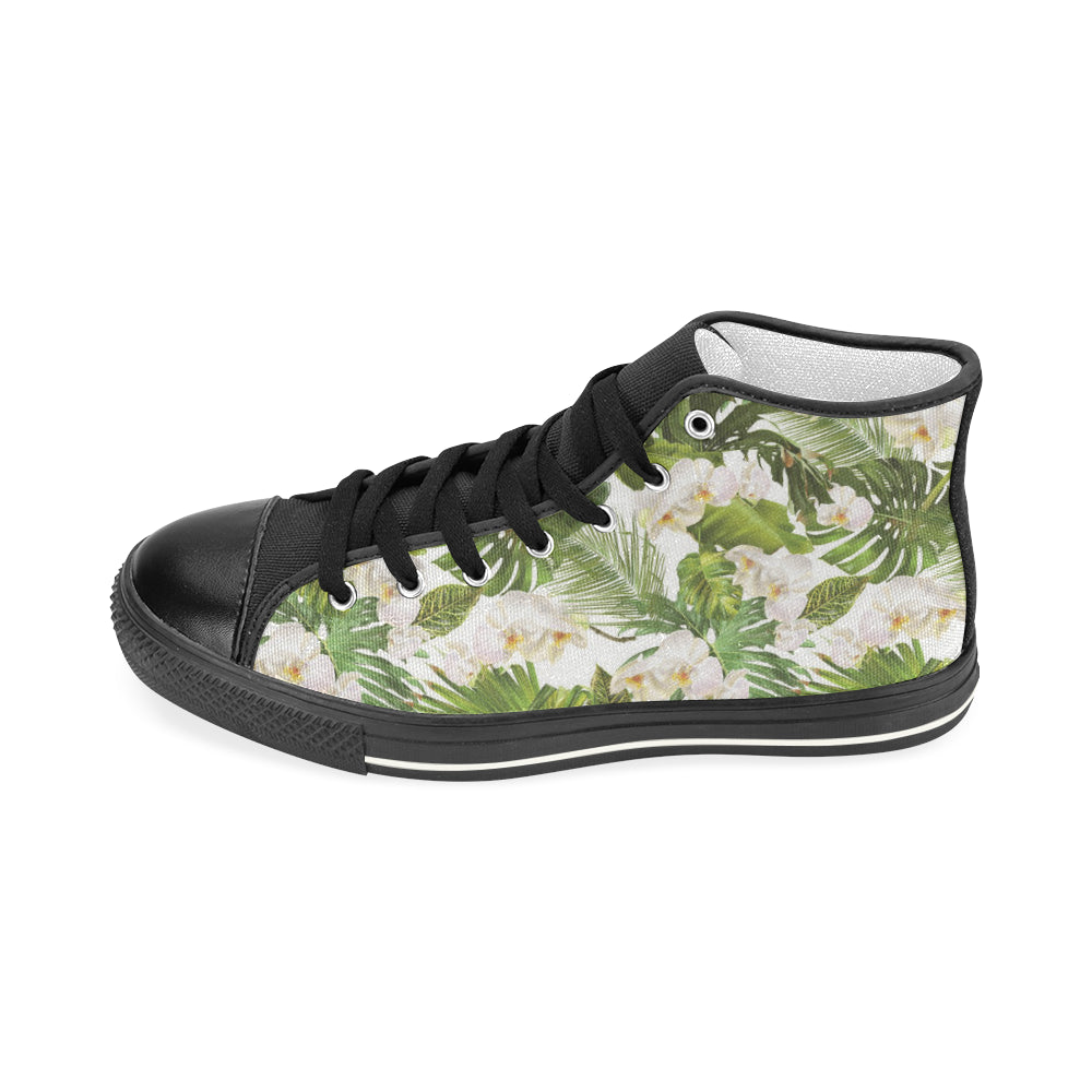 White orchid flower tropical leaves pattern Women's High Top Canvas Shoes Black