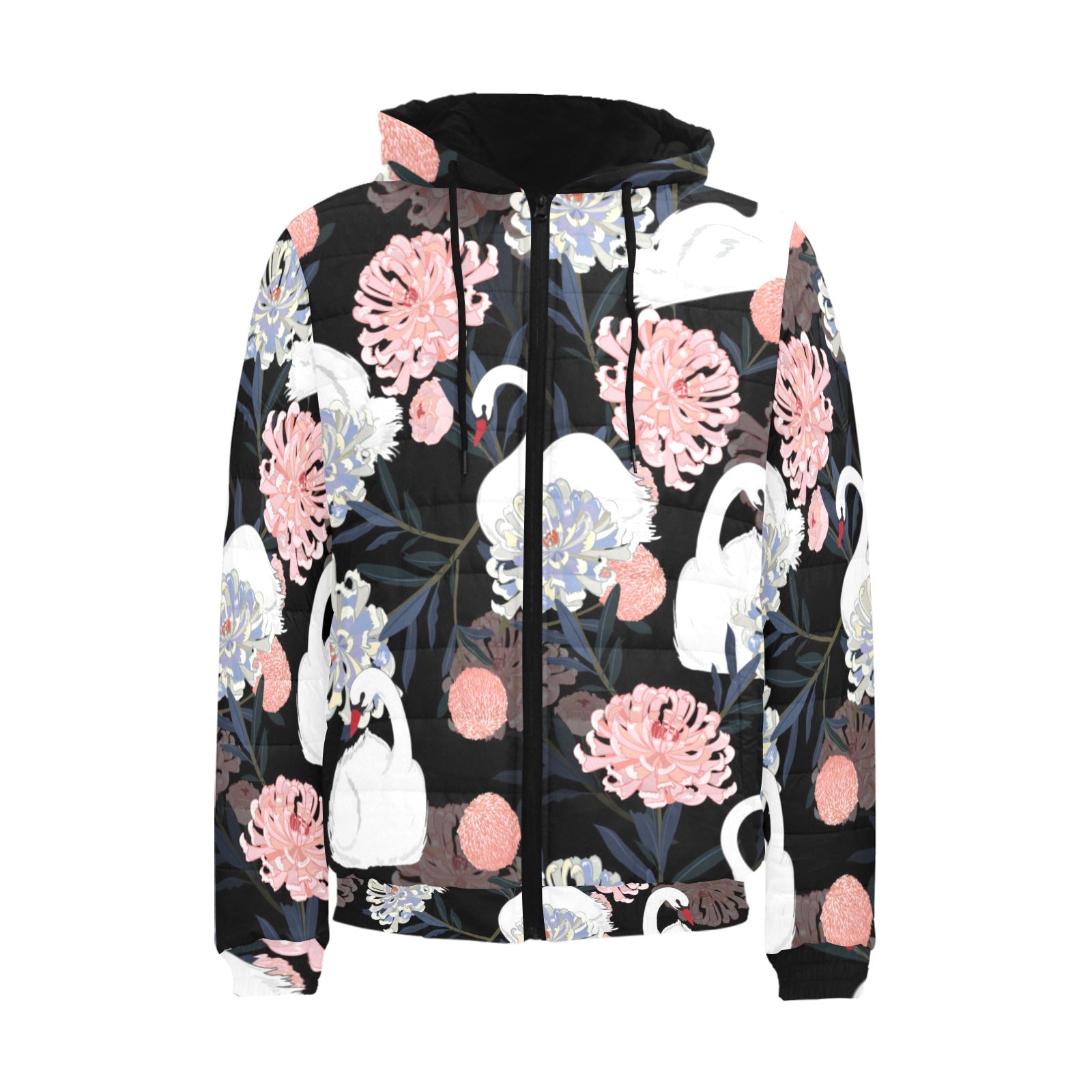 white swan blooming flower pattern Men's Padded Hooded Jacket