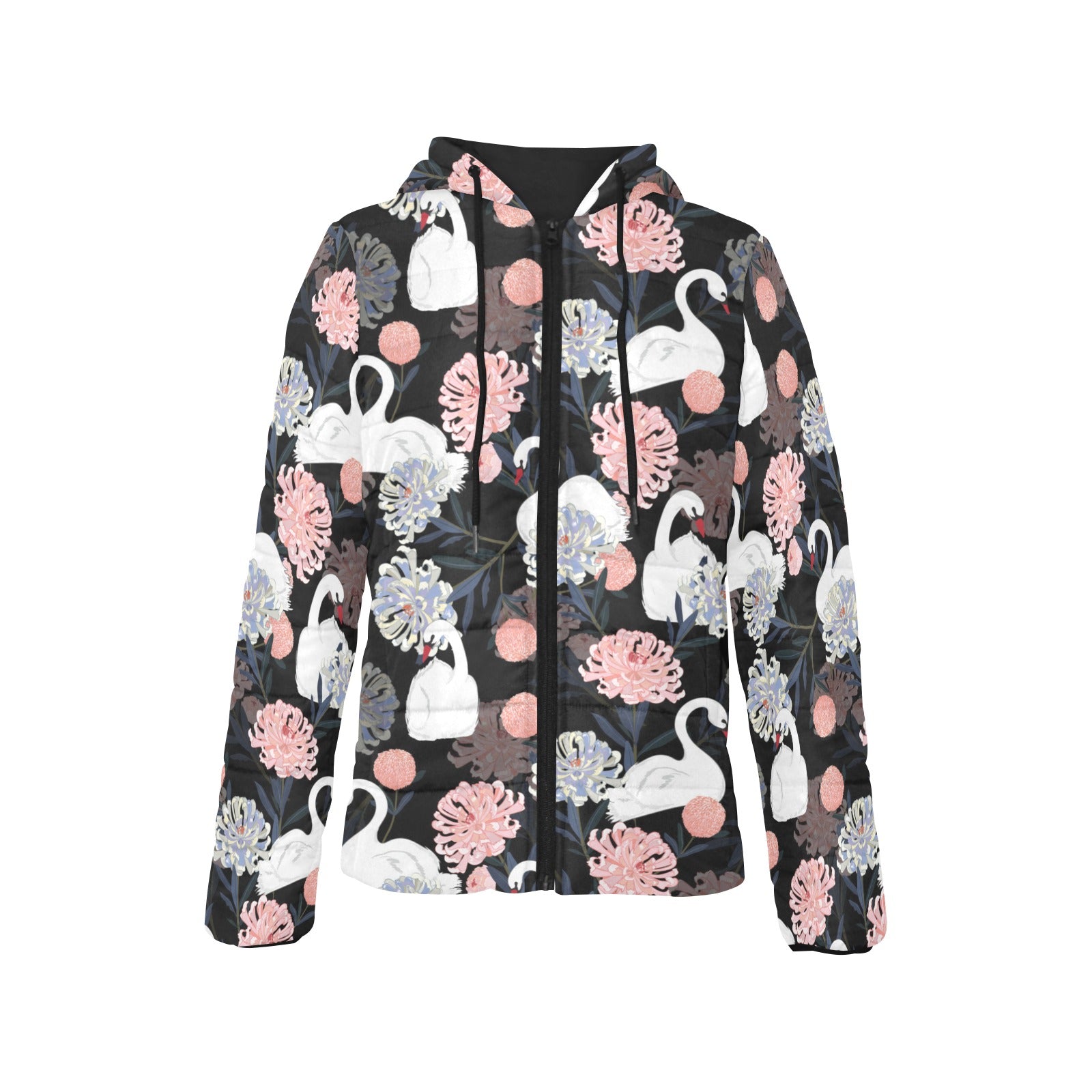 white swan blooming flower pattern Women's Padded Hooded Jacket