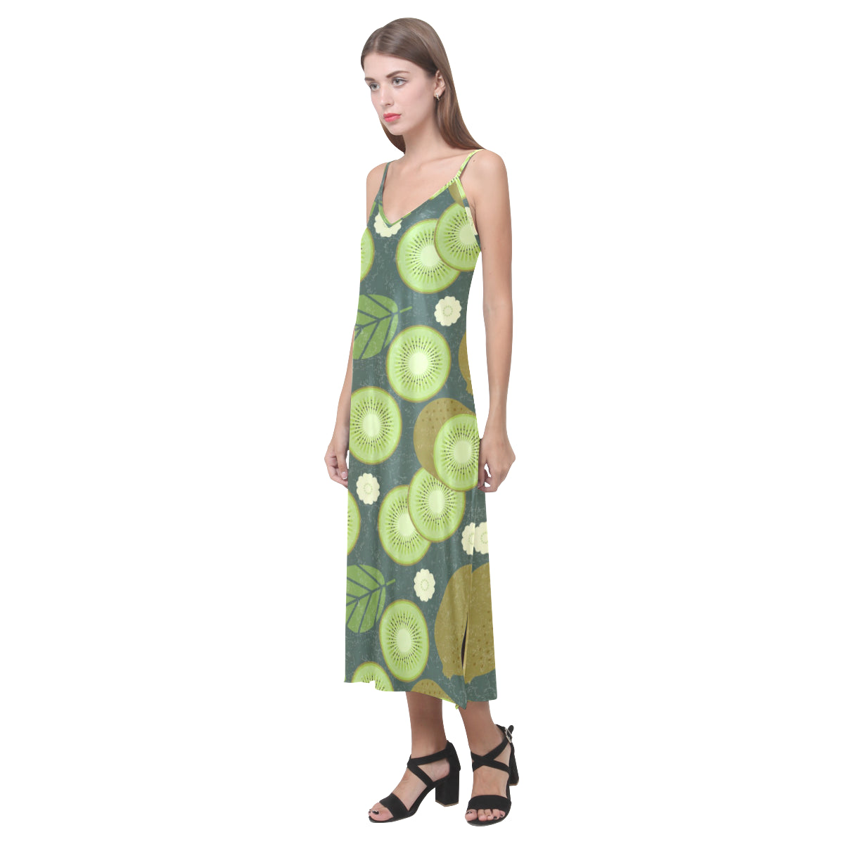 Whole sliced kiwi leave and flower V-Neck Open Fork Long Dress