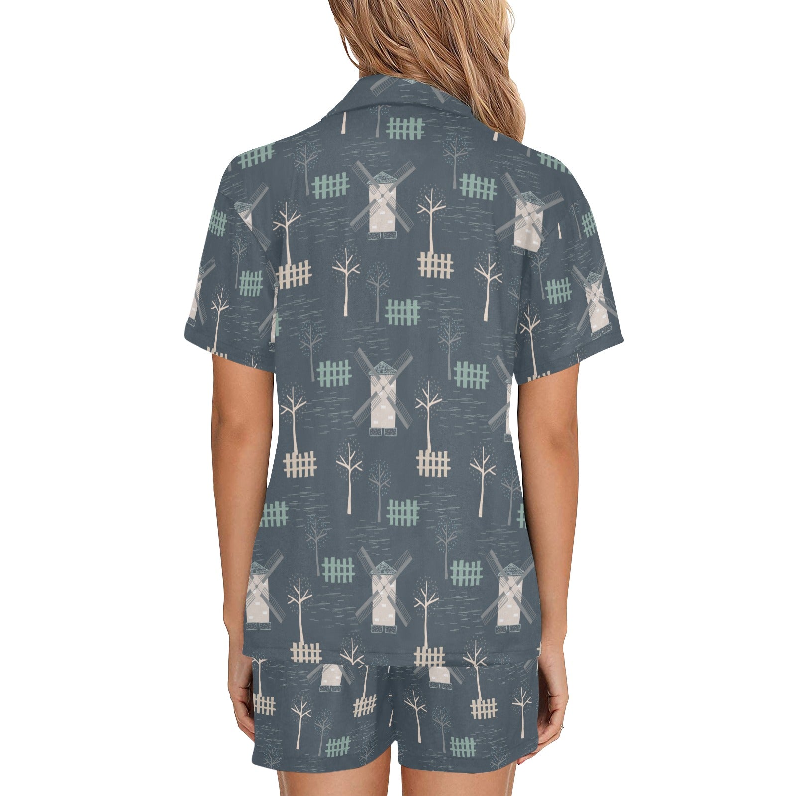 windmill tree pattern Women's V-Neck Short Pajama Set