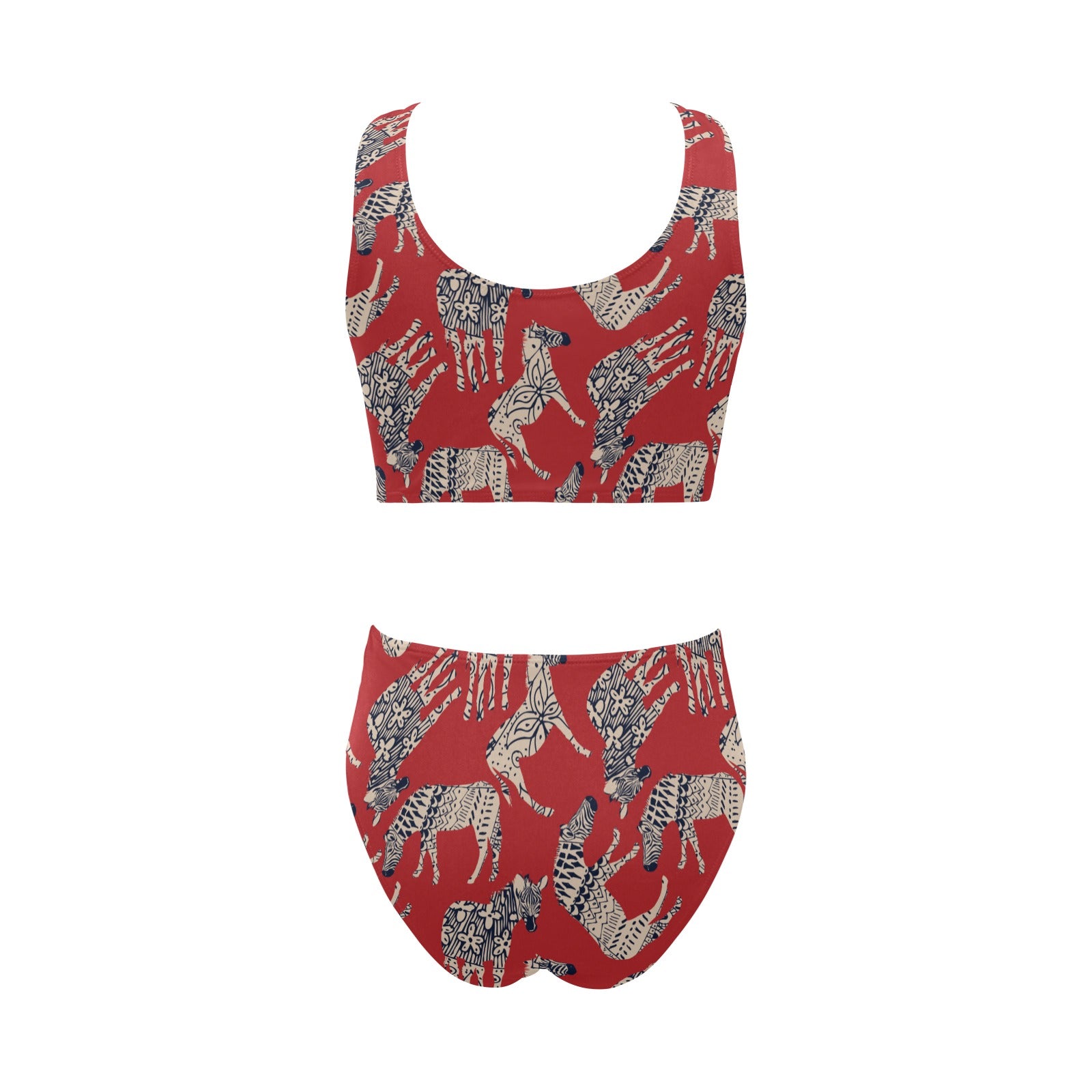 Zebra abstract red background Chest Bowknot High Waisted Bikini Swimsuit