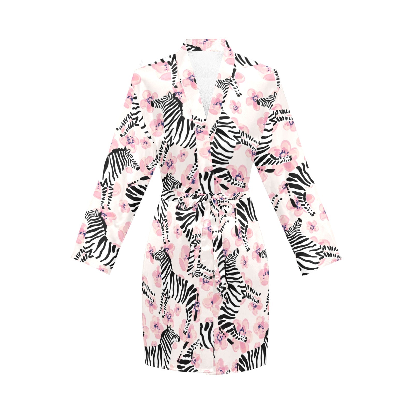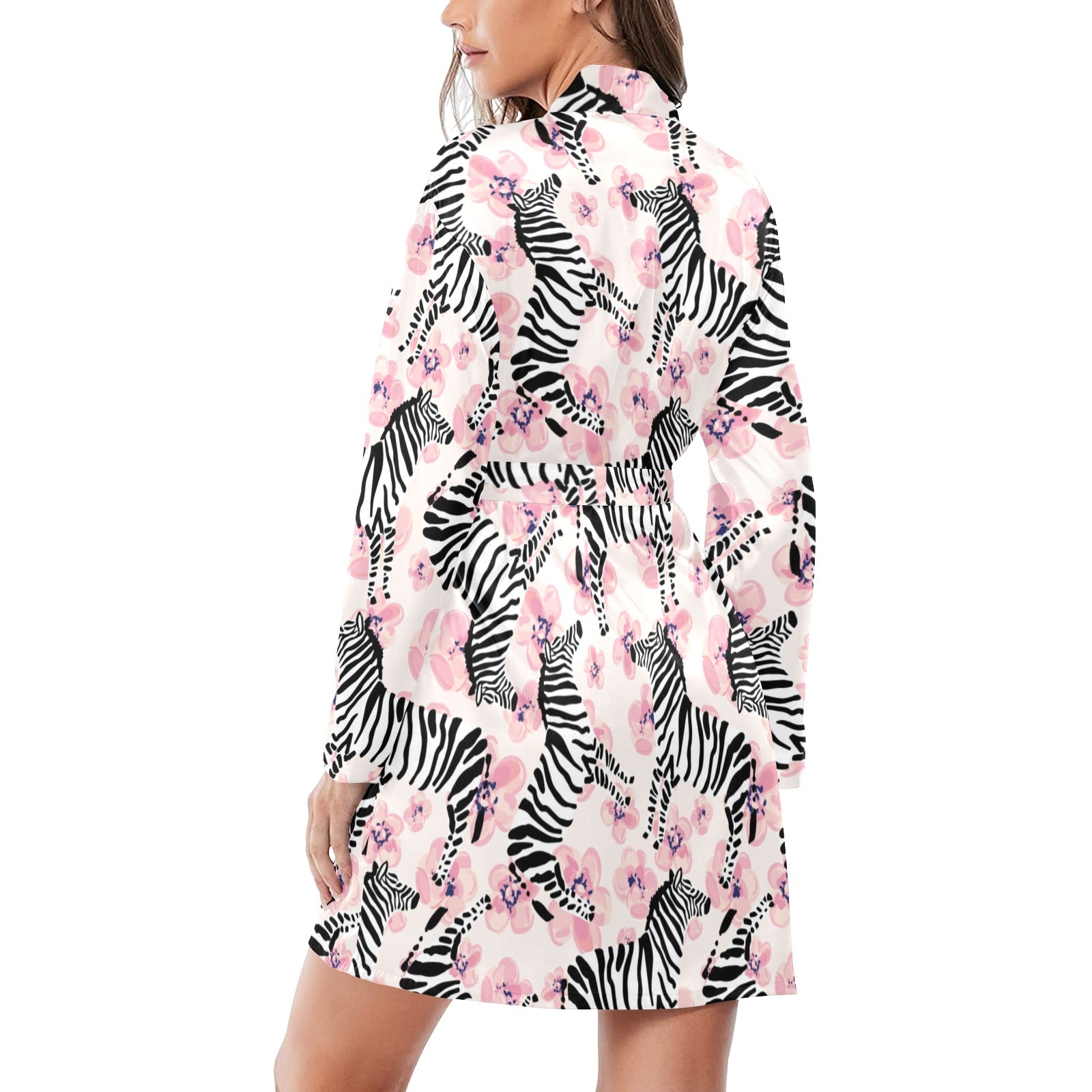 Zebra pink flower background Women's Long Sleeve Belted Night Robe