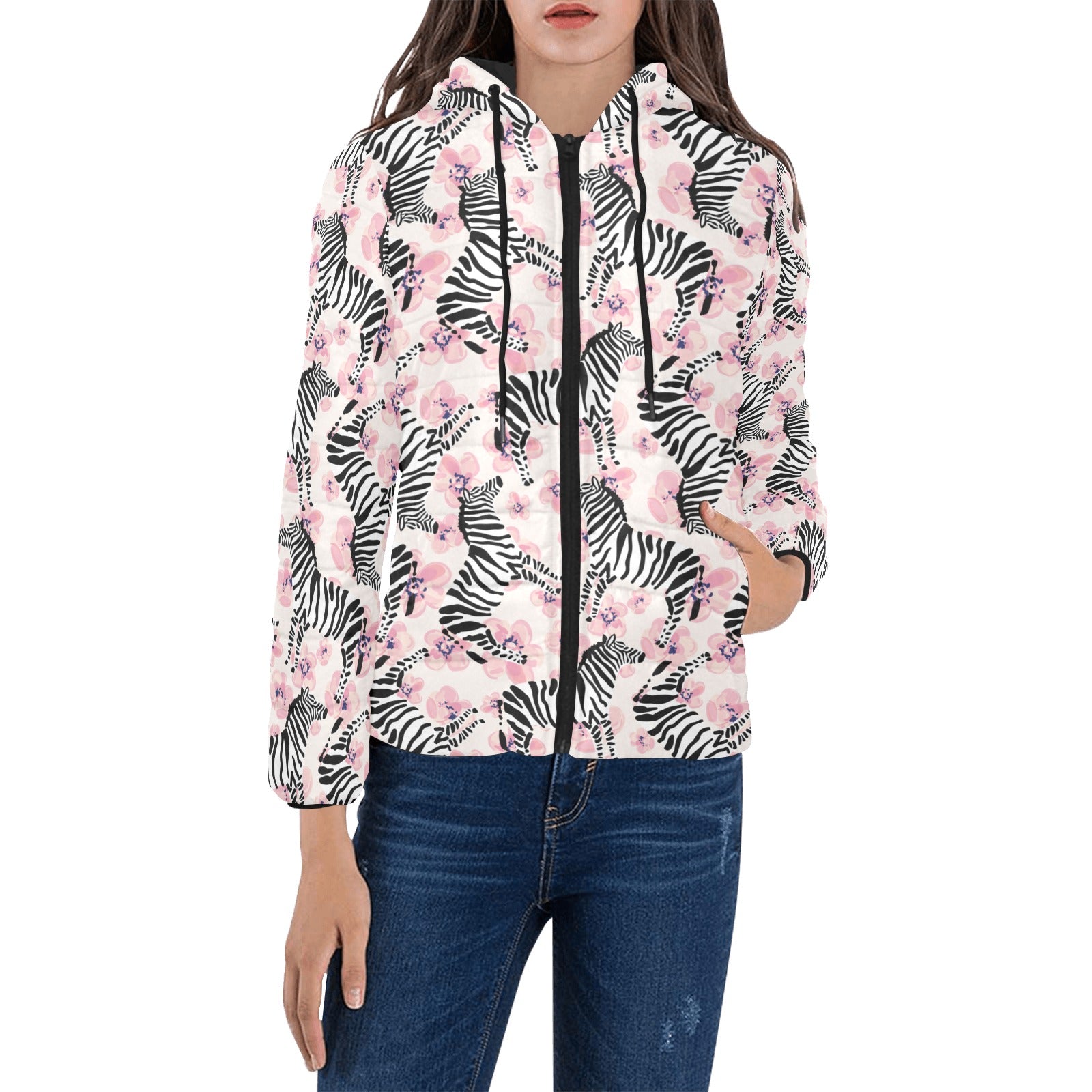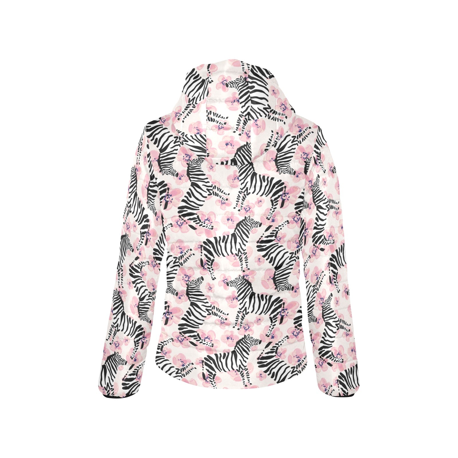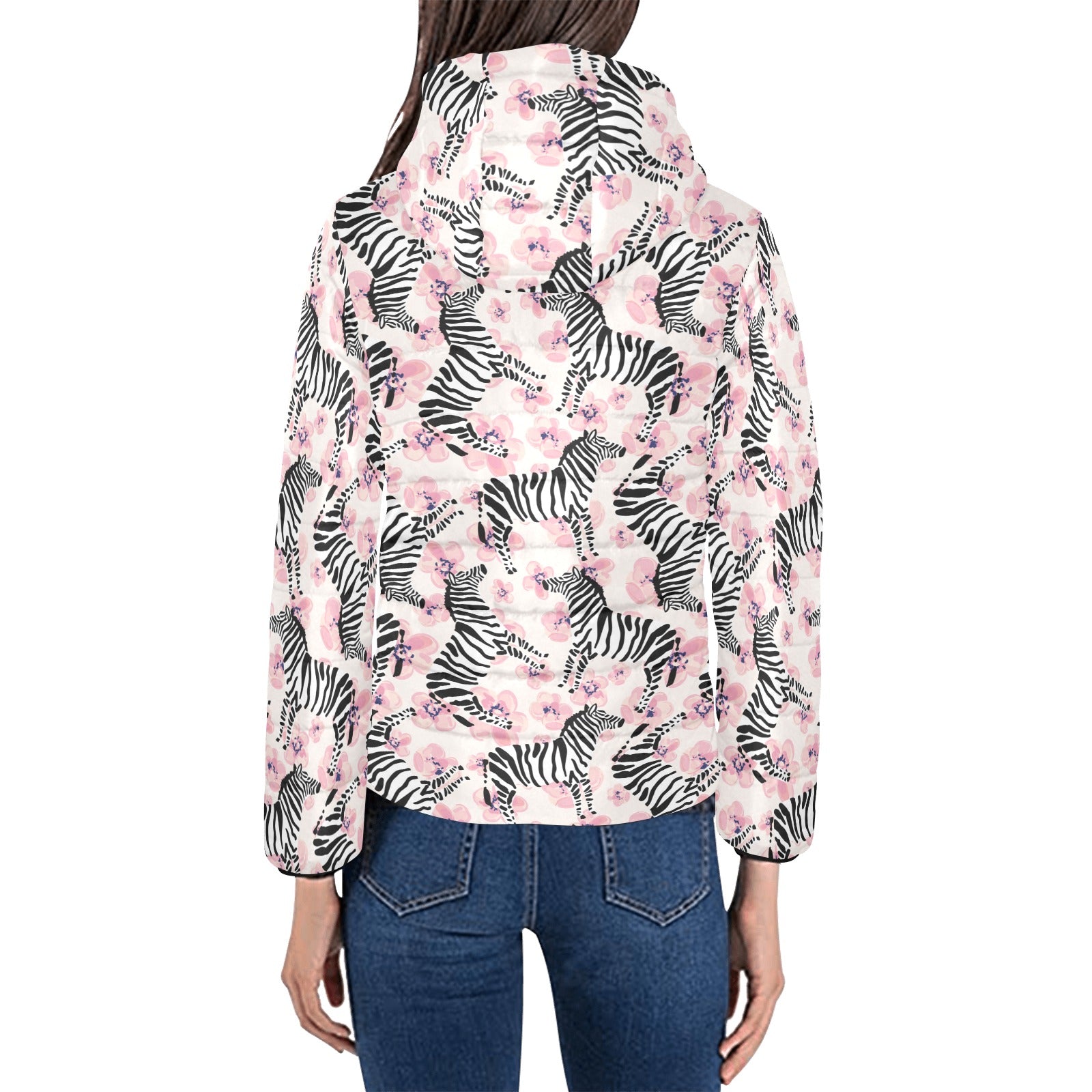 Zebra pink flower background Women's Padded Hooded Jacket