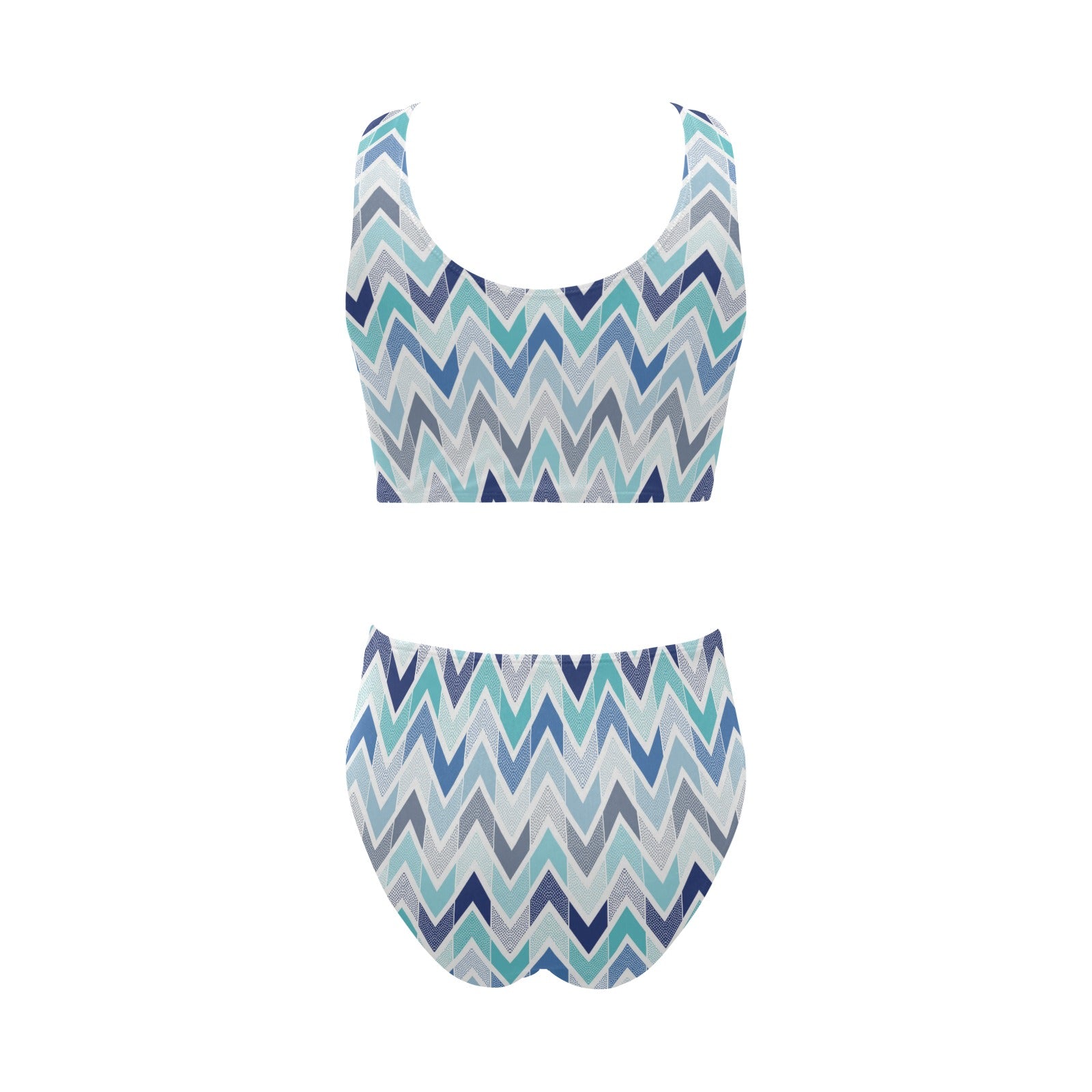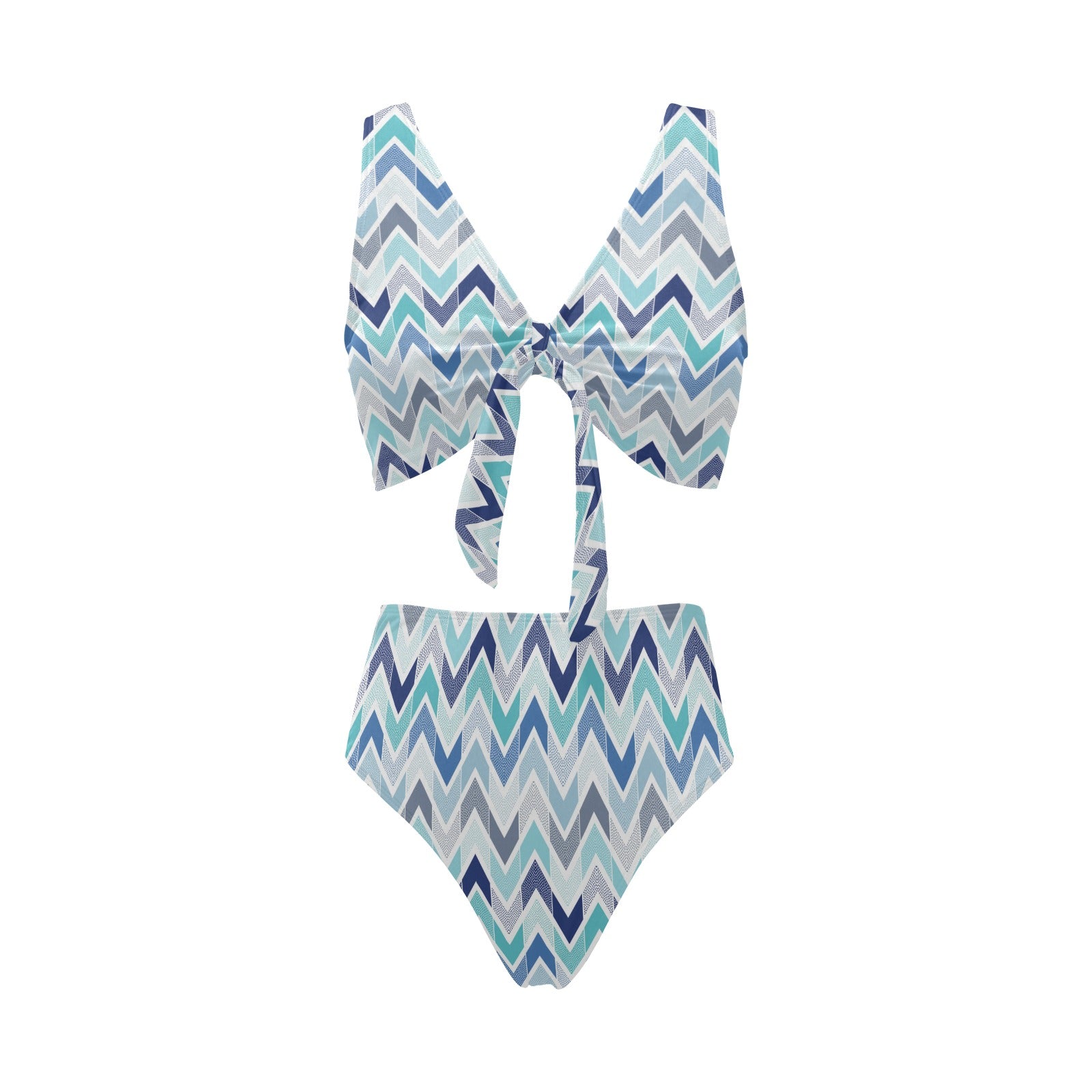 zigzag chevron blue pattern Chest Bowknot High Waisted Bikini Swimsuit
